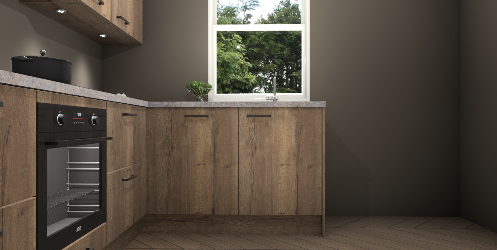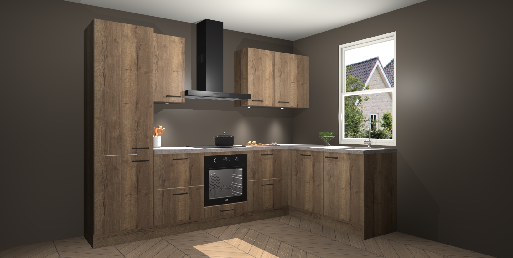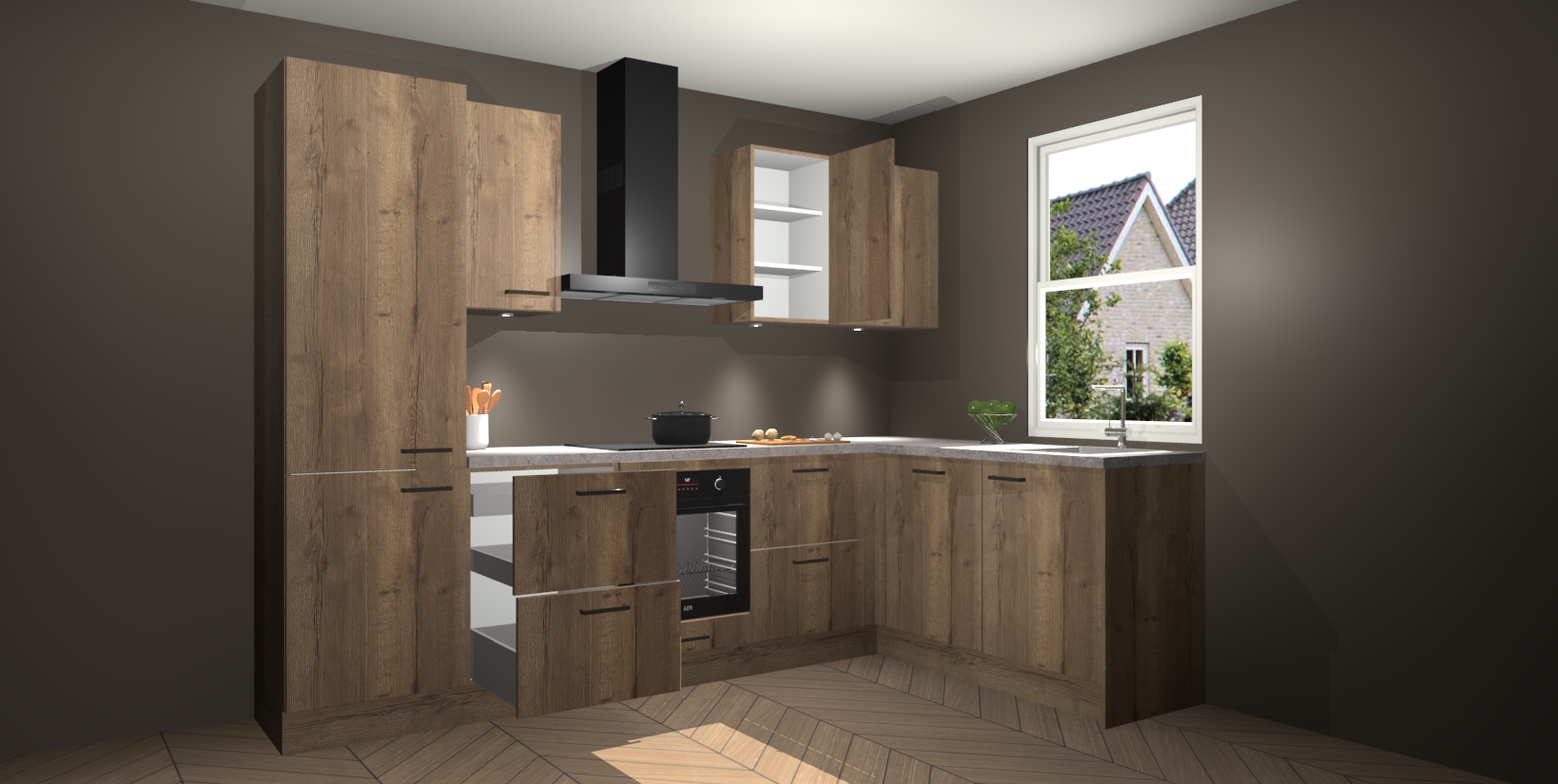 Maak kennis met de trendsettende en luxe Chocolade Eiken keuken Bazel! Deze uitzonderlijke keuken van Duitse kwaliteit is stijlvol, modern en perfect om elk huis mee op te fleuren. De binnenkant van de kasten worden meegenomen in een bijpassende kleur om een samenhangende eigentijdse esthetiek te voltooien. U zult dol zijn op hoe uw pas gerenoveerde keuken eruitziet met de Chocolade Eiken editie!