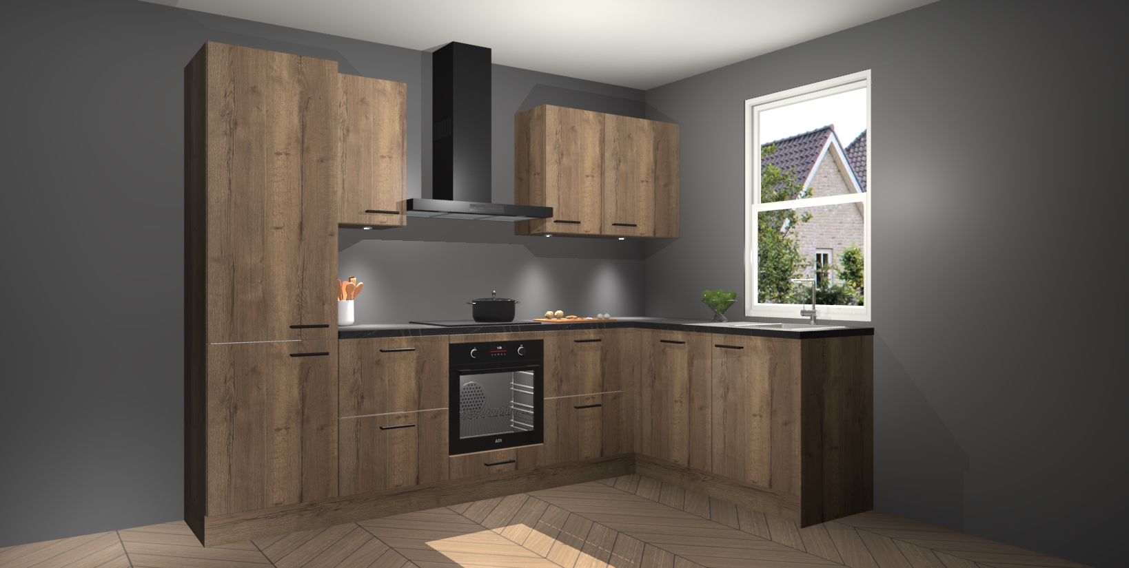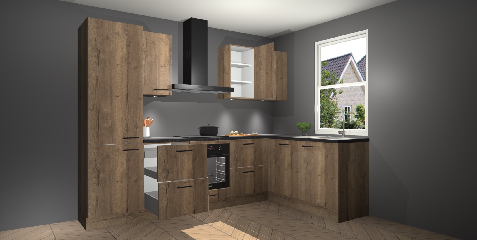 Maak kennis met de trendsettende en luxe Chocolade Eiken keuken Bazel! Deze uitzonderlijke keuken van Duitse kwaliteit is stijlvol, modern en perfect om elk huis mee op te fleuren. De binnenkant van de kasten worden meegenomen in een bijpassende kleur om een samenhangende eigentijdse esthetiek te voltooien. U zult dol zijn op hoe uw pas gerenoveerde keuken eruitziet met de Chocolade Eiken editie!