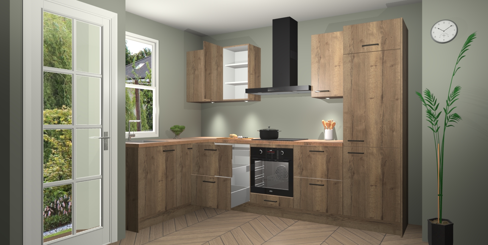 U hoeft zich ook geen zorgen te maken over een gebrek aan opbergruimte, want deze keuken heeft voldoende opbergmogelijkheden zowel boven als onder het aanrecht. Om het leven nog makkelijker te maken, wordt deze moderne hoekkeuken geleverd met 5 ingebouwde apparaten, waaronder een oven, inductiekookplaat, afzuigkap, vaatwasser en koelkast, zodat u in een mum van tijd klaar bent voor actie!