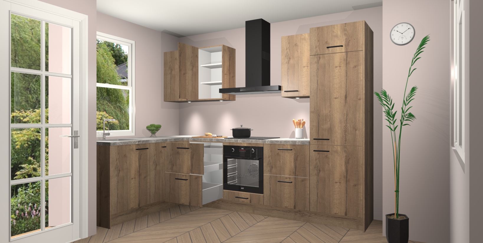 U hoeft zich ook geen zorgen te maken over een gebrek aan opbergruimte, want deze keuken heeft voldoende opbergmogelijkheden zowel boven als onder het aanrecht. Om het leven nog makkelijker te maken, wordt deze moderne hoekkeuken geleverd met 5 ingebouwde apparaten, waaronder een oven, inductiekookplaat, afzuigkap, vaatwasser en koelkast, zodat u in een mum van tijd klaar bent voor actie!