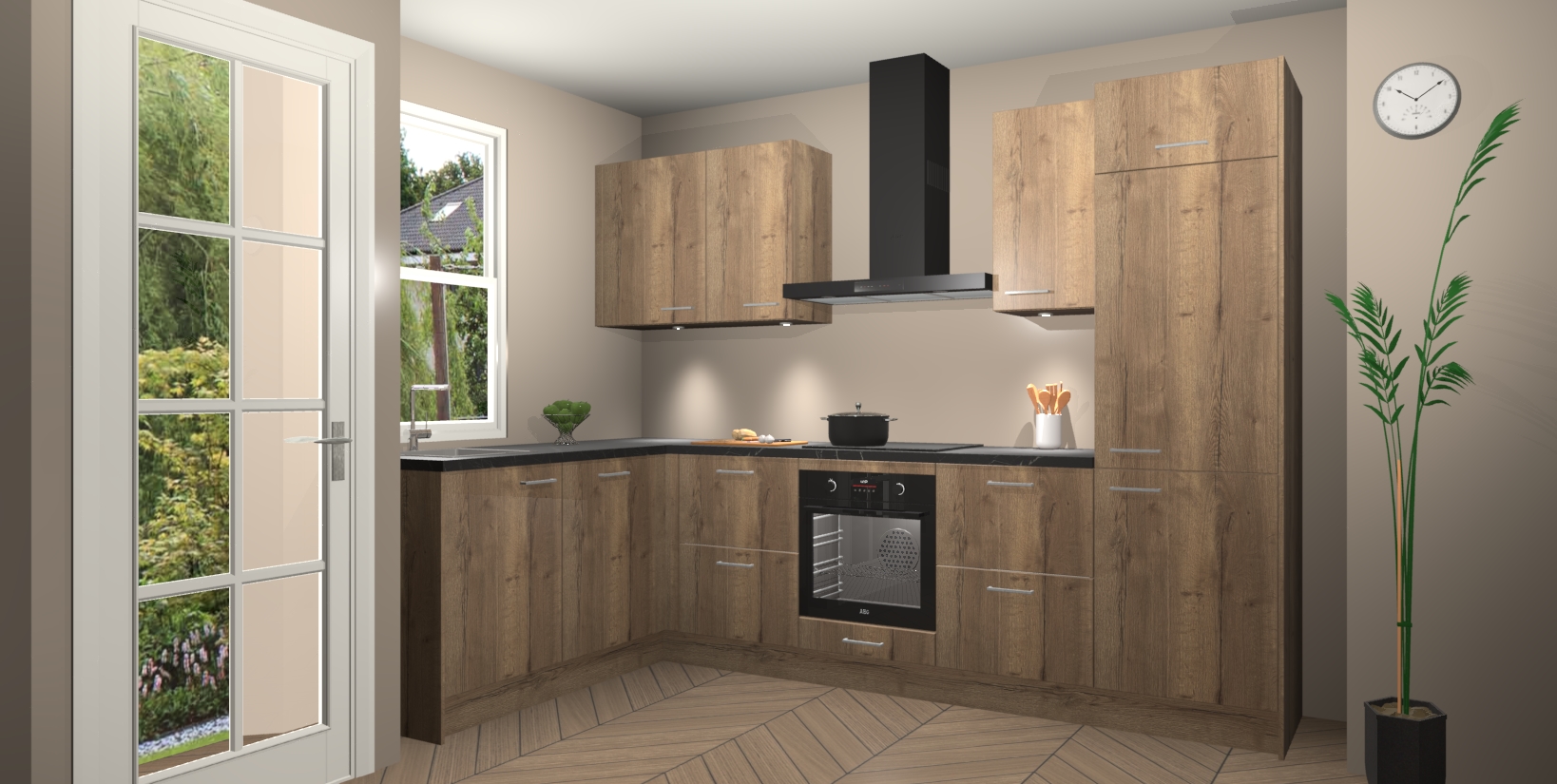 Bent u op zoek naar een strakke, moderne hoekkeuken die uw huis oppept en een moderne uitstraling geeft? Kijk dan niet verder dan de chocolade eiken keuken Beijing. Deze verbluffende hoekkeuken tilt hedendaags design naar een hoger niveau. Qua stijl is deze chique hoekkeuken voorzien van chocolade eiken accenten, om een strakke maar opvallende look te creëren. De binnenkant van de kasten is afgewerkt in dezelfde prachtige chocolade eiken kleur voor extra esthetische aantrekkingskracht.