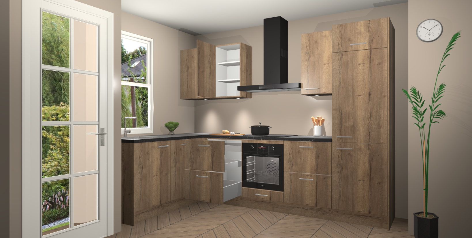U hoeft zich ook geen zorgen te maken over een gebrek aan opbergruimte, want deze keuken heeft voldoende opbergmogelijkheden zowel boven als onder het aanrecht. Om het leven nog makkelijker te maken, wordt deze moderne hoekkeuken geleverd met 5 ingebouwde apparaten, waaronder een oven, inductiekookplaat, afzuigkap, vaatwasser en koelkast, zodat u in een mum van tijd klaar bent voor actie!