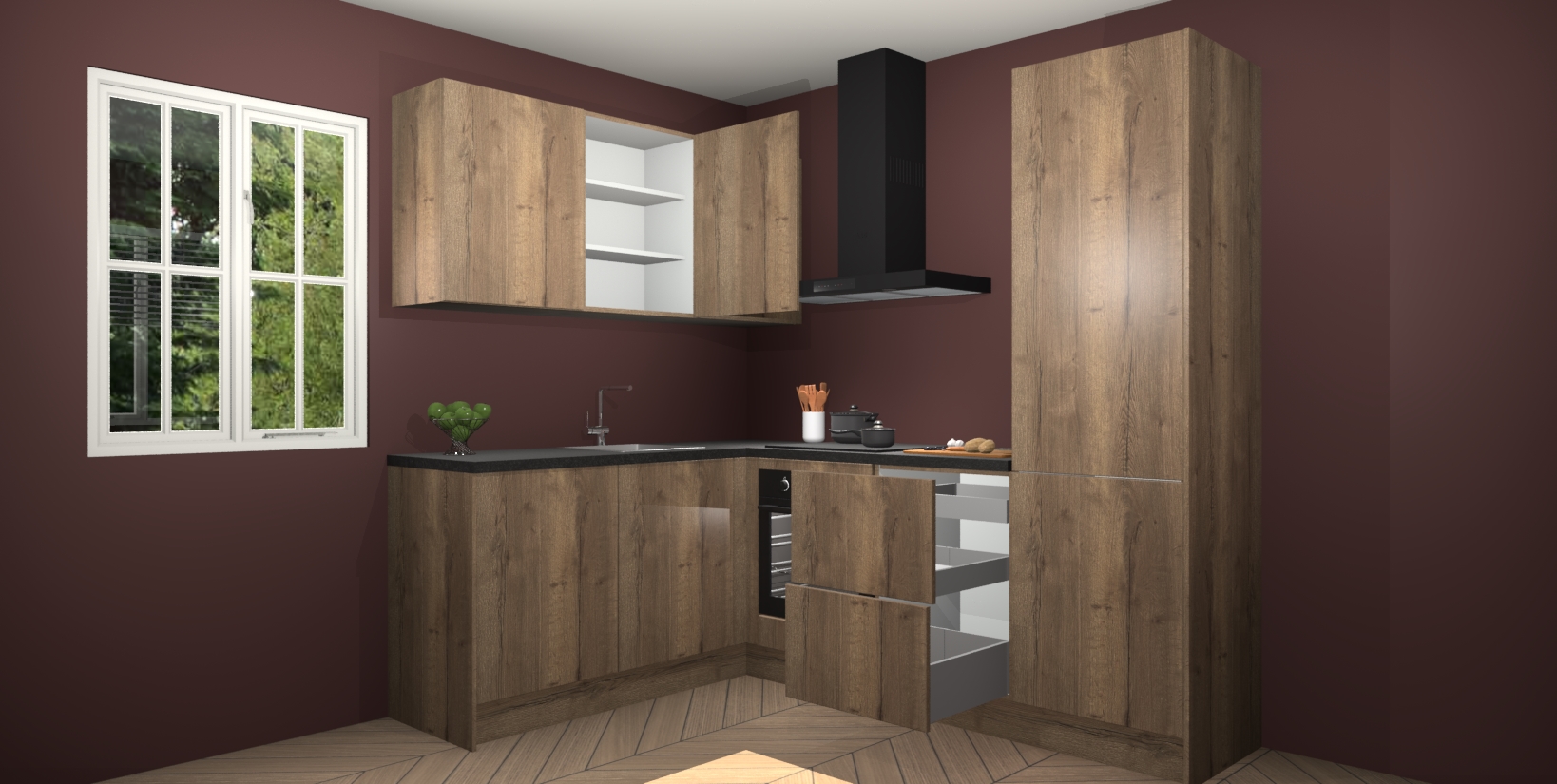 Maak kennis met de Chocolade Eiken keuken Boekarest, een moderne hoekkeuken waar al uw vrienden en familie jaloers op zullen zijn! Het verbluffende mooie ontwerp past in elk interieur en is een ideale keuze voor wie op zoek is naar een klassieke, maar verfijnde look.