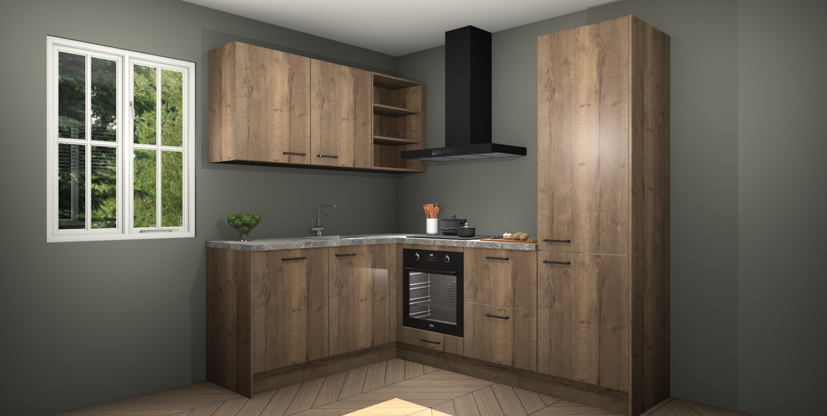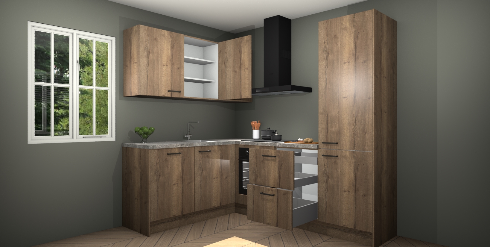 Maak kennis met de Chocolade Eiken keuken Boekarest, een moderne hoekkeuken waar al uw vrienden en familie jaloers op zullen zijn! Het verbluffende mooie ontwerp past in elk interieur en is een ideale keuze voor wie op zoek is naar een klassieke, maar verfijnde look.
