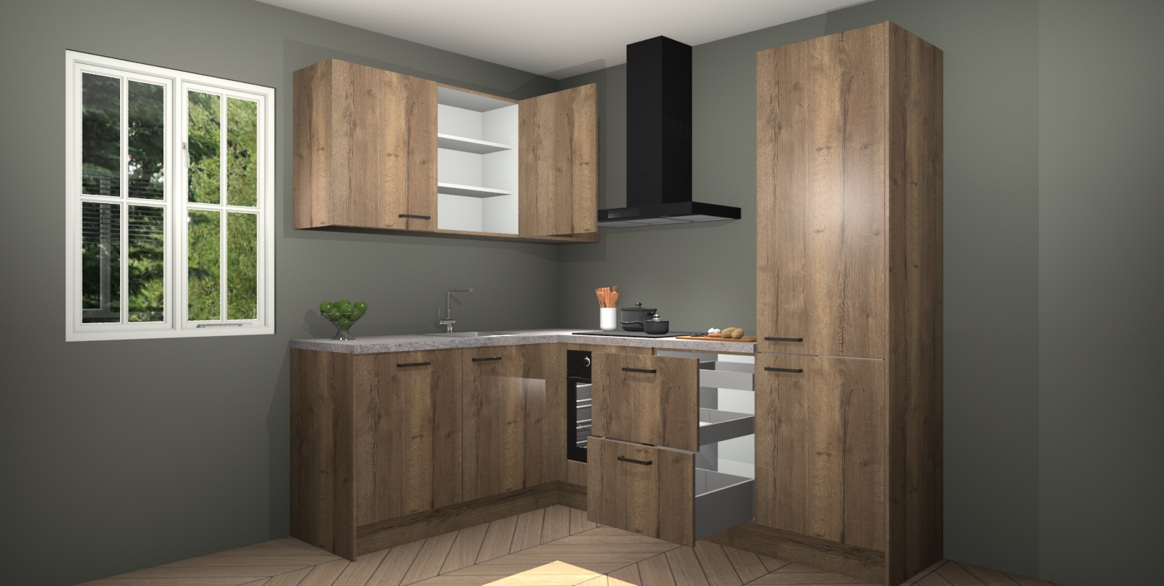 Maak kennis met de Chocolade Eiken keuken Boekarest, een moderne hoekkeuken waar al uw vrienden en familie jaloers op zullen zijn! Het verbluffende mooie ontwerp past in elk interieur en is een ideale keuze voor wie op zoek is naar een klassieke, maar verfijnde look.