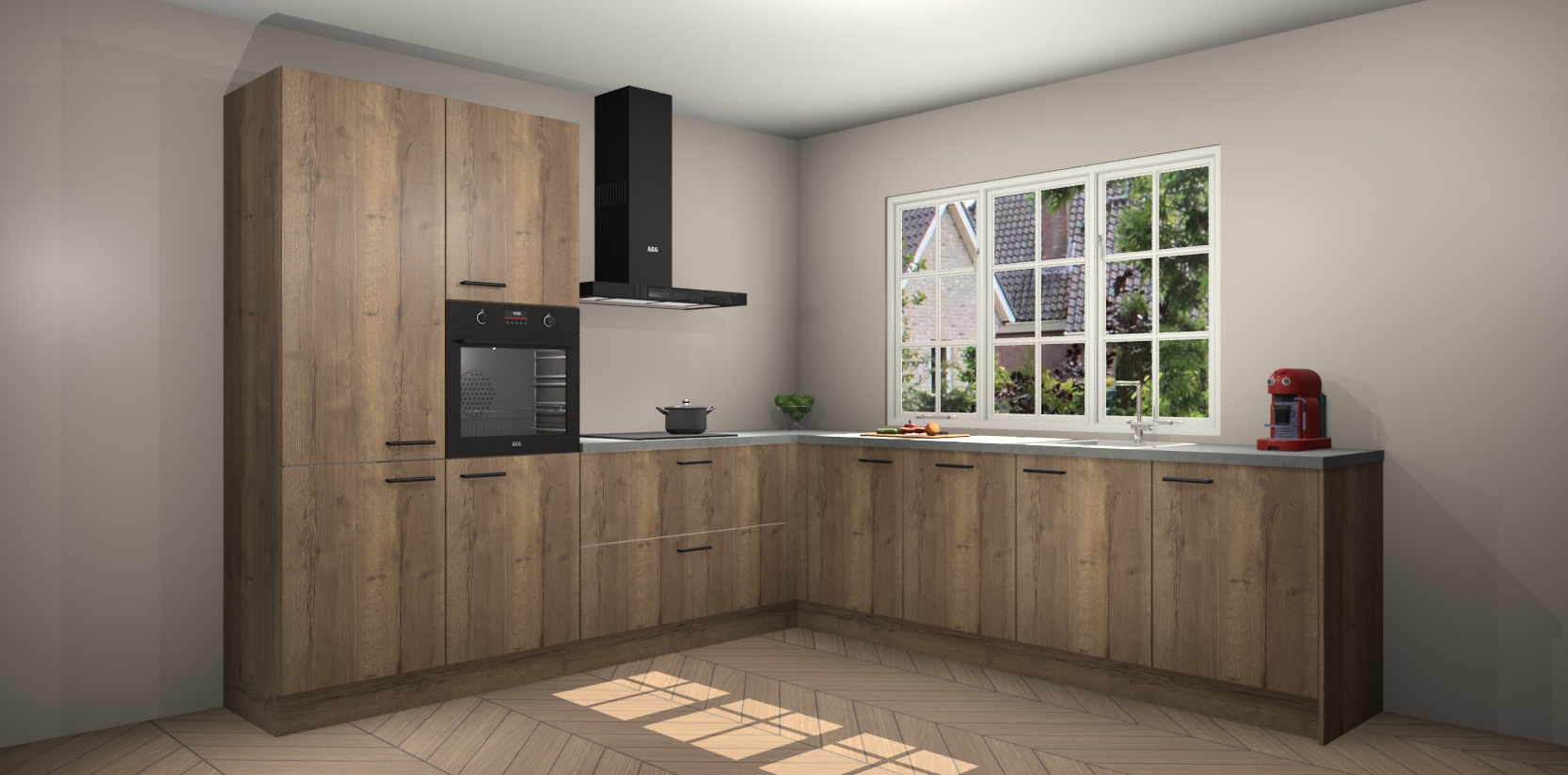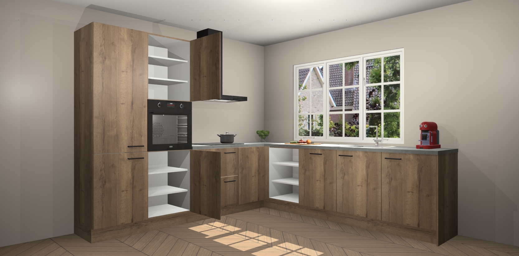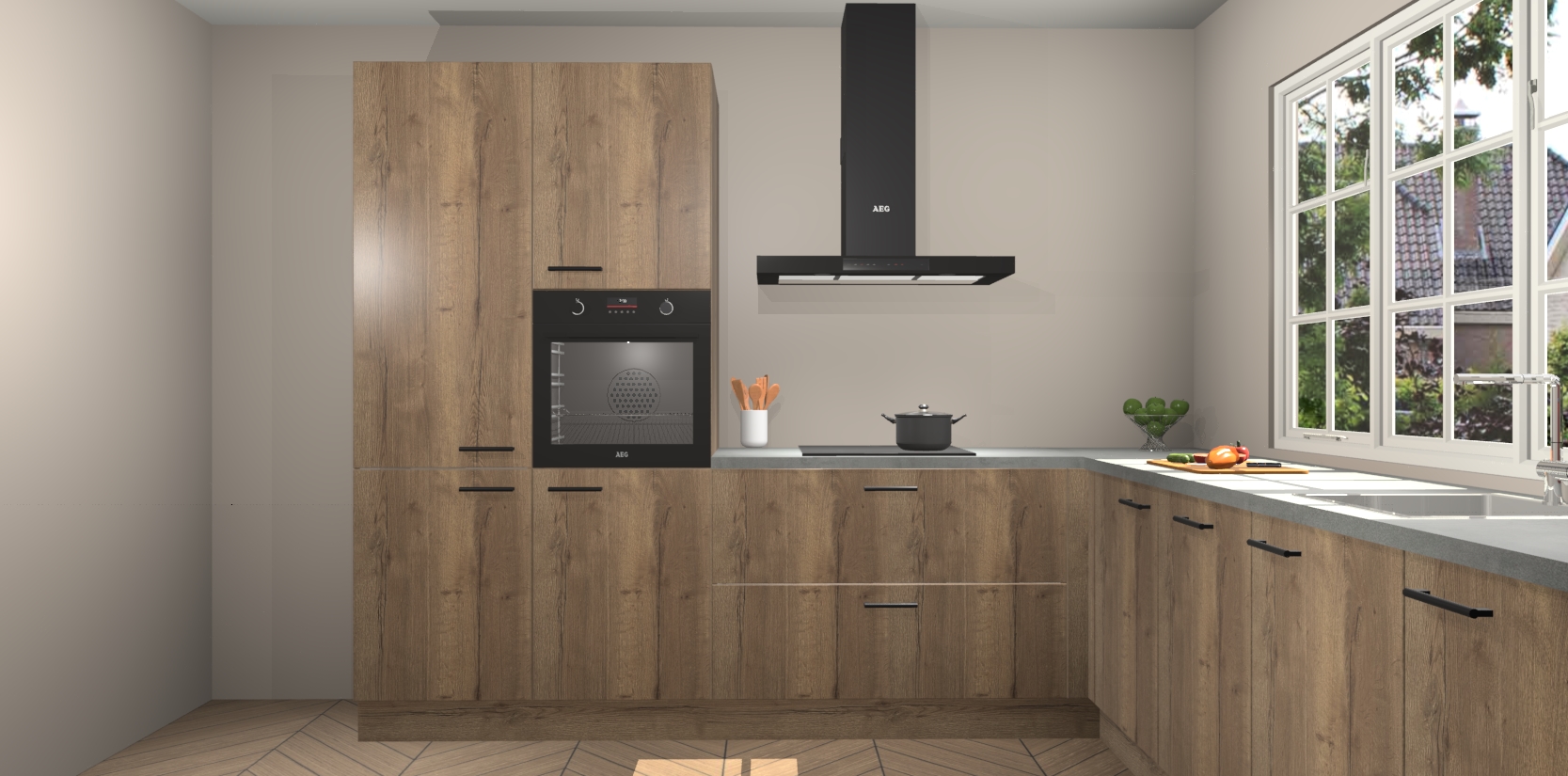 De keuken heeft veel opbergruimte, waardoor u alle ingrediënten gemakkelijk bereikbaar hebt staan. En daarnaast bevat deze volledig uitgeruste keuken ook 5 ingebouwde apparaten: een oven, inductiekookplaat, afzuigkap, vaatwasser en koelkast. Deze zijn heel eenvoudig na bestellen te upgraden naar AEG als u dit wilt. Bovendien zijn de softclose-kastdeuren ideaal; geef ze gewoon even een tikje en ze sluiten automatisch met geruisloze precisie.