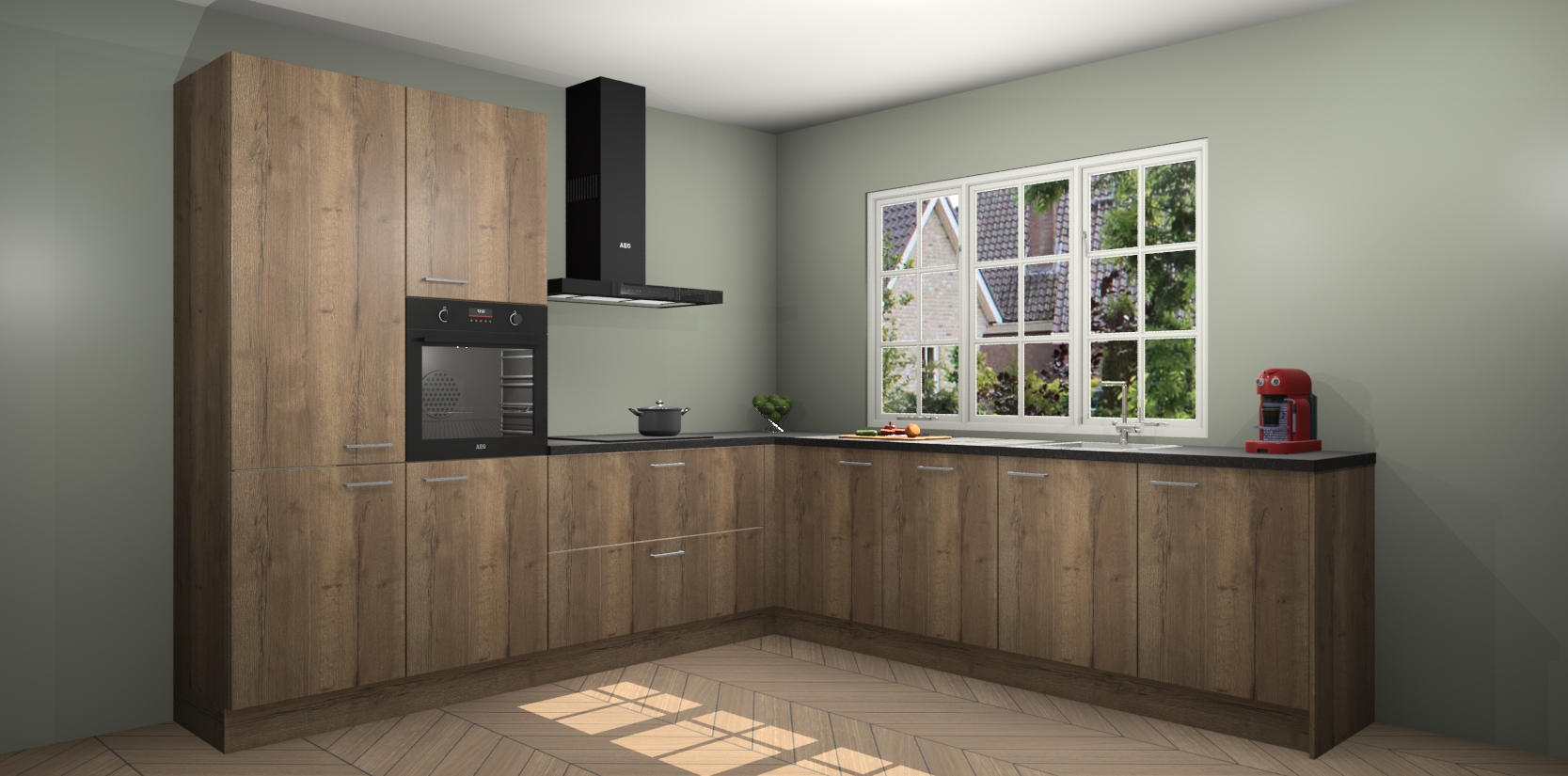 Welkom in de nieuwe wereld van een moderne keuken: de Chocolade Eiken keuken Casablanca! Met dit innovatieve keukendesign haalt u de natuur naar binnen. Neem plaats aan uw hout-look keuken en voel u verbonden met de prachtige Chocolade Eiken kleur. Zeer gebruiksvriendelijk, ervaring door prettige materialen en kleur die perfect aansluiten bij uw sfeerkeuze in huis.