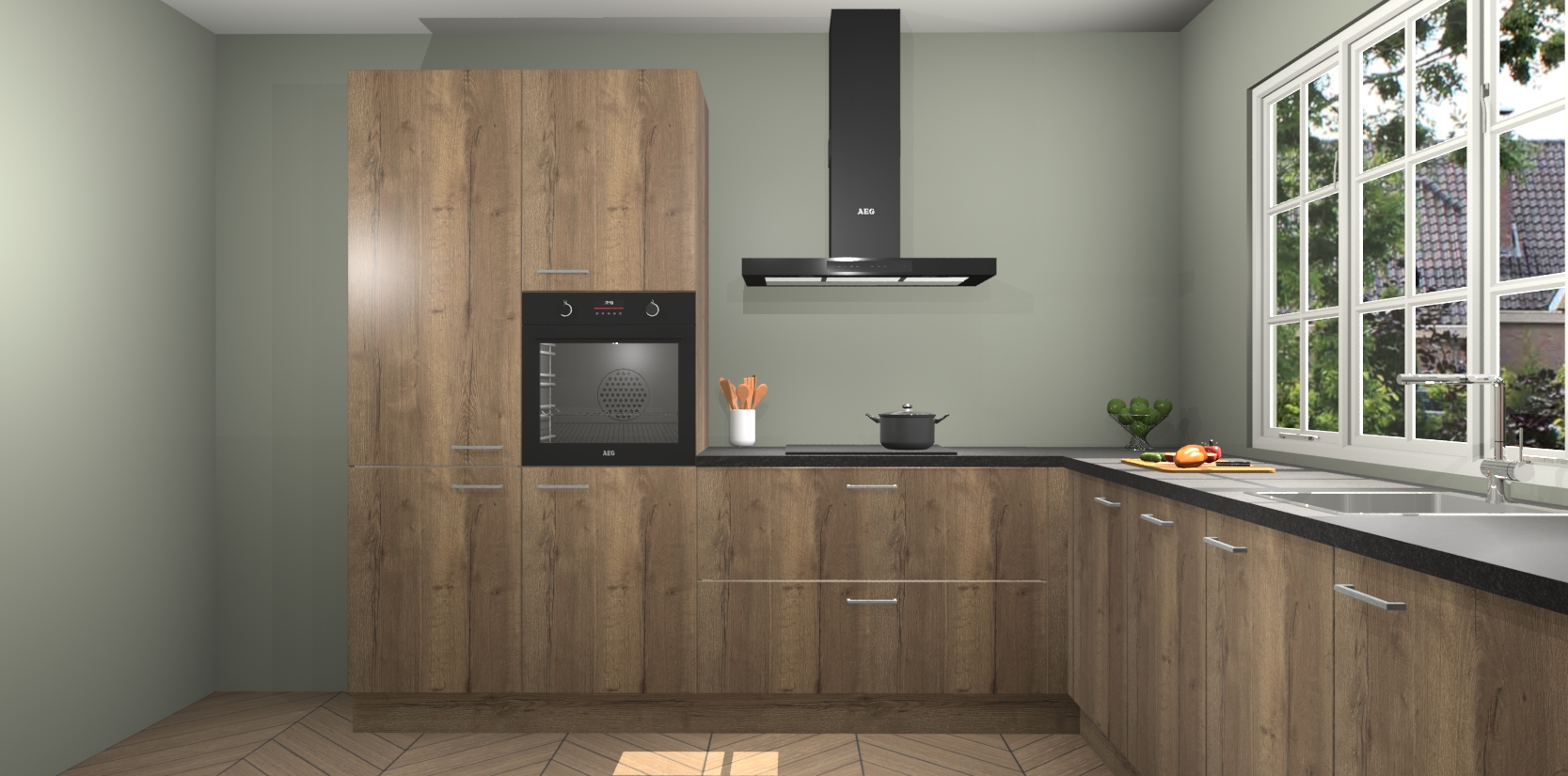 De keuken heeft veel opbergruimte, waardoor u alle ingrediënten gemakkelijk bereikbaar hebt staan. En daarnaast bevat deze volledig uitgeruste keuken ook 5 ingebouwde apparaten: een oven, inductiekookplaat, afzuigkap, vaatwasser en koelkast. Deze zijn heel eenvoudig na bestellen te upgraden naar AEG als u dit wilt. Bovendien zijn de softclose-kastdeuren ideaal; geef ze gewoon even een tikje en ze sluiten automatisch met geruisloze precisie.