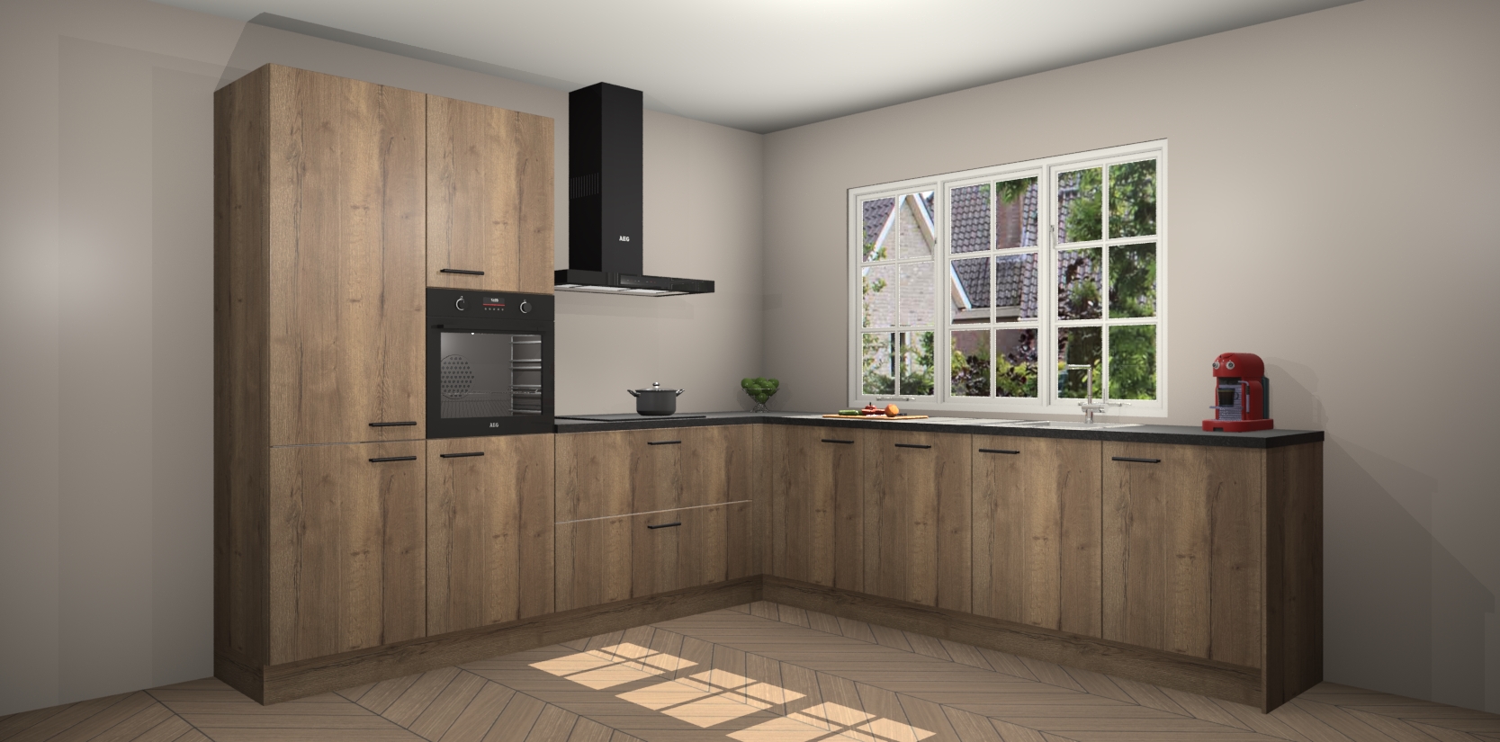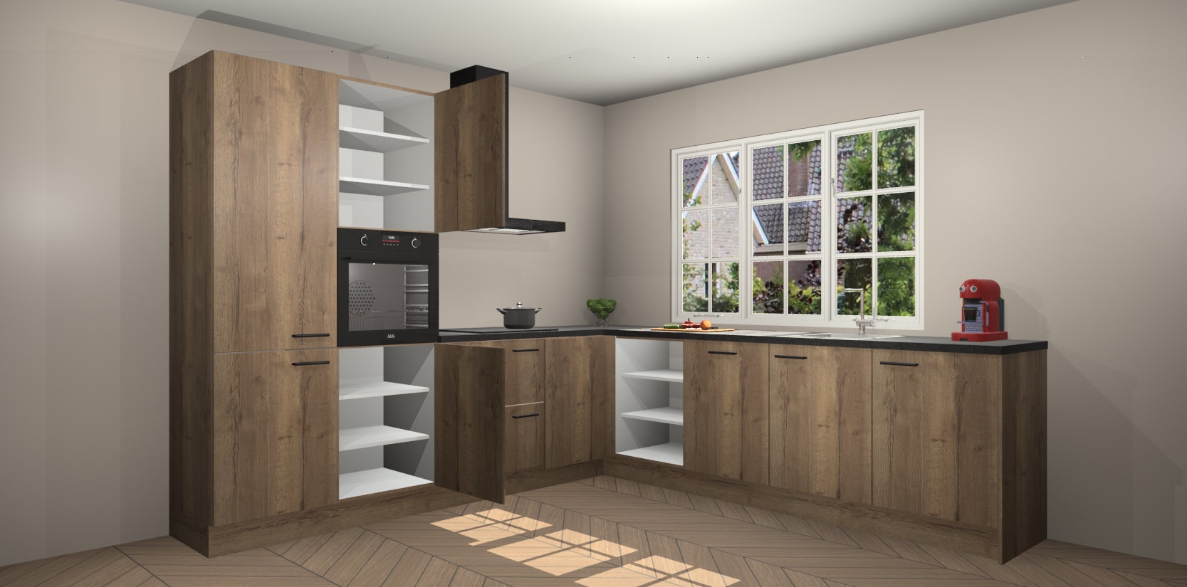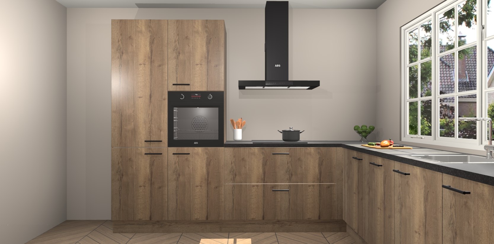 De keuken heeft veel opbergruimte, waardoor u alle ingrediënten gemakkelijk bereikbaar hebt staan. En daarnaast bevat deze volledig uitgeruste keuken ook 5 ingebouwde apparaten: een oven, inductiekookplaat, afzuigkap, vaatwasser en koelkast. Deze zijn heel eenvoudig na bestellen te upgraden naar AEG als u dit wilt. Bovendien zijn de softclose-kastdeuren ideaal; geef ze gewoon even een tikje en ze sluiten automatisch met geruisloze precisie.