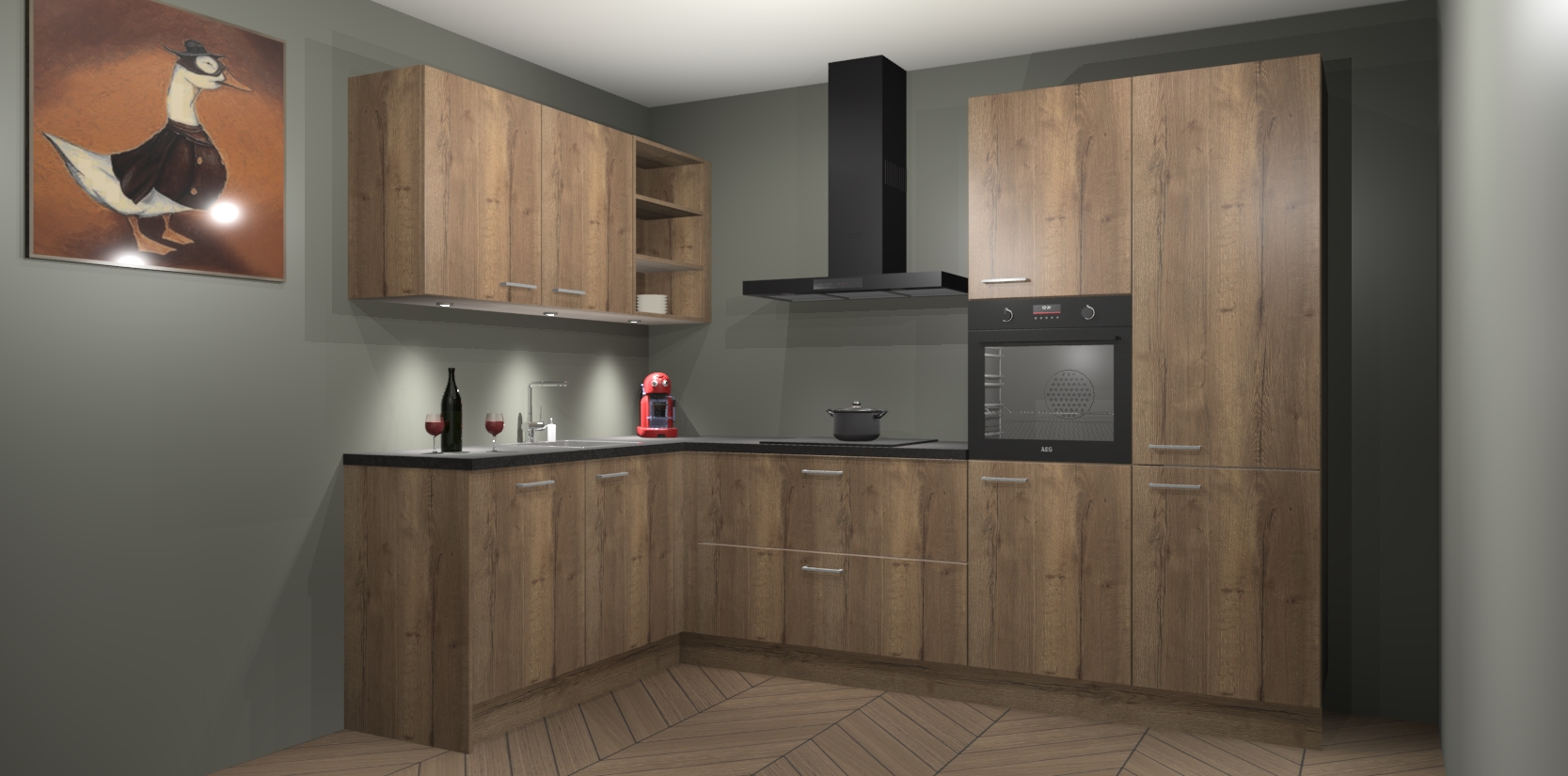 De Chocolade Eiken keuken Cognac is een adembenemend ontwerp met een modern en tijdloos uiterlijk. Deze luxe keuken straalt echt aristocratisch uit, waardoor uw koken plezieriger zal worden! Het prachtige design begint bij de hoekkeuken, wat perfect past bij elk type interieur. Bovendien bevat deze hoogwaardige set vijf inbouwapparaten - van oven tot koelkast - die via bestelling naar AEG geüpgraded kunnen worden!
