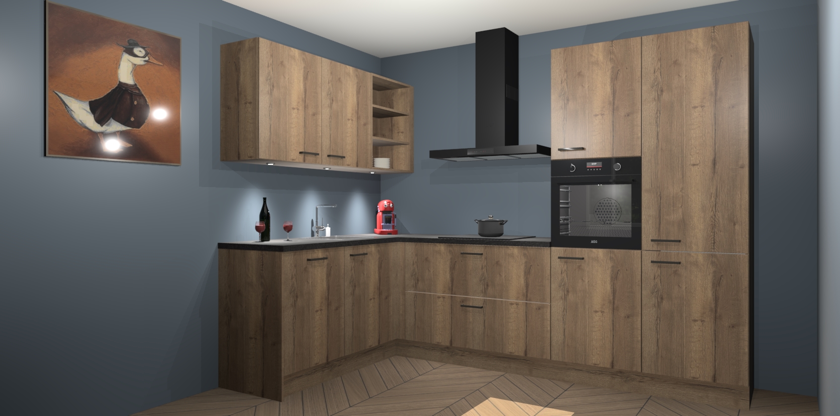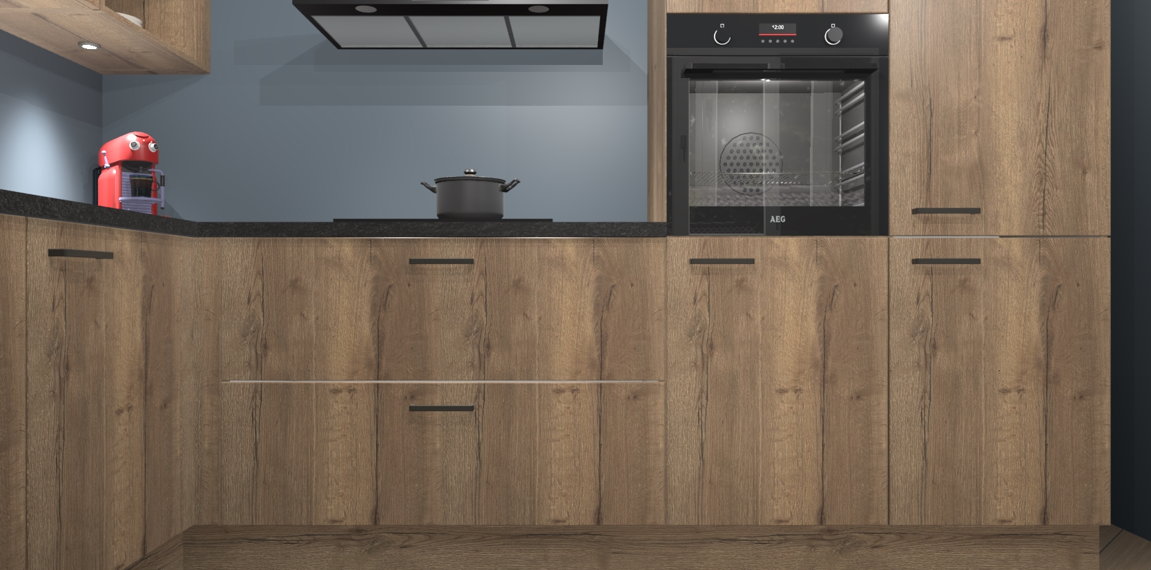De Chocolade Eiken keuken Cognac is een adembenemend ontwerp met een modern en tijdloos uiterlijk. Deze luxe keuken straalt echt aristocratisch uit, waardoor uw koken plezieriger zal worden! Het prachtige design begint bij de hoekkeuken, wat perfect past bij elk type interieur. Bovendien bevat deze hoogwaardige set vijf inbouwapparaten - van oven tot koelkast - die via bestelling naar AEG geüpgraded kunnen worden!