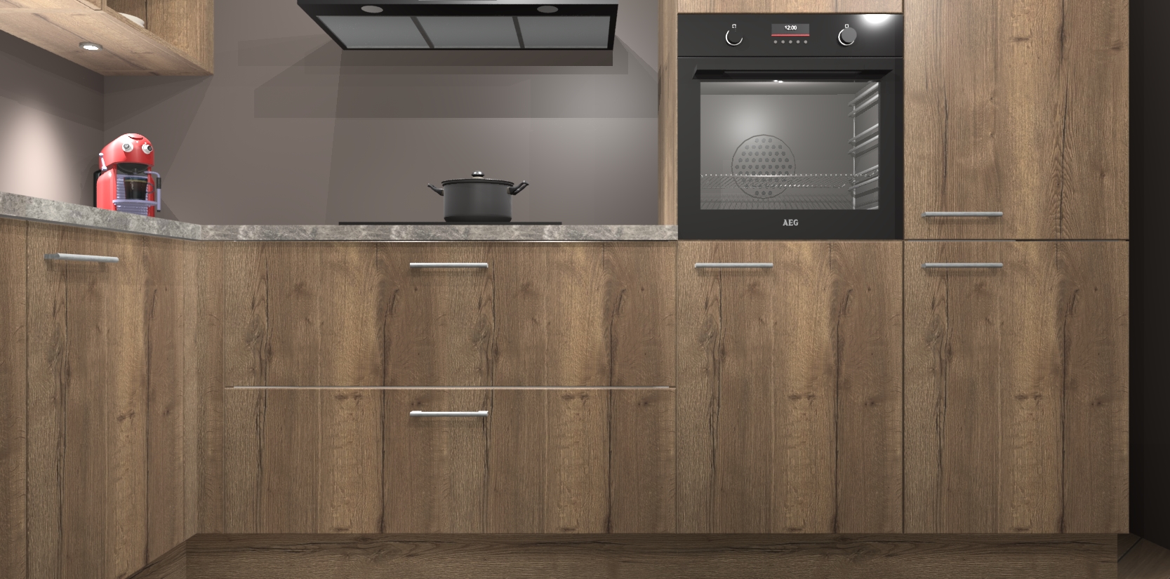 De Chocolade Eiken keuken Cognac is een adembenemend ontwerp met een modern en tijdloos uiterlijk. Deze luxe keuken straalt echt aristocratisch uit, waardoor uw koken plezieriger zal worden! Het prachtige design begint bij de hoekkeuken, wat perfect past bij elk type interieur. Bovendien bevat deze hoogwaardige set vijf inbouwapparaten - van oven tot koelkast - die via bestelling naar AEG geüpgraded kunnen worden!