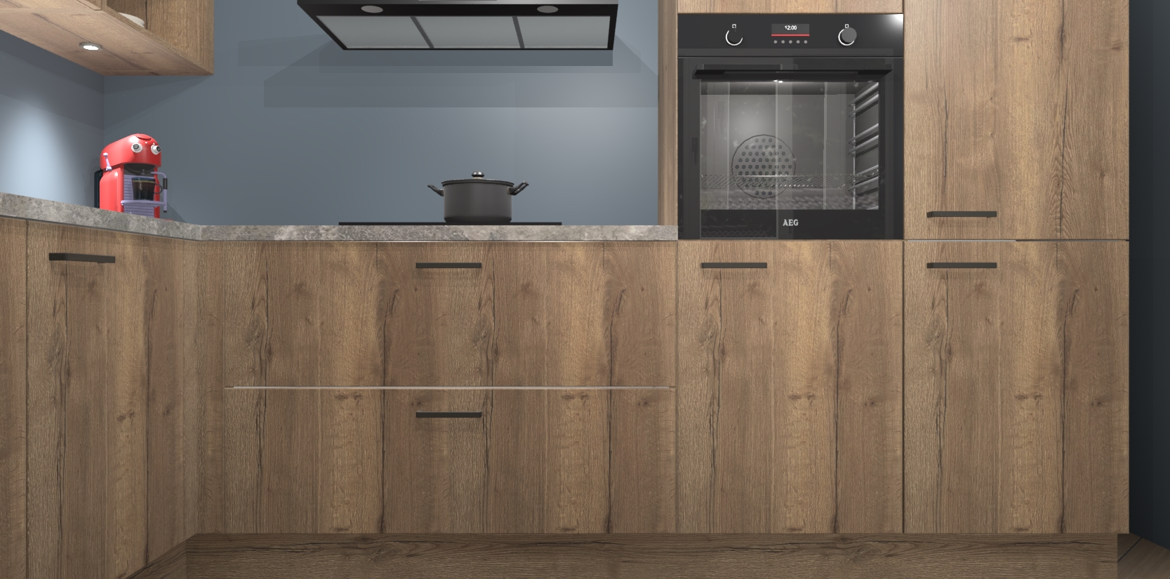 De Chocolade Eiken keuken Cognac is een adembenemend ontwerp met een modern en tijdloos uiterlijk. Deze luxe keuken straalt echt aristocratisch uit, waardoor uw koken plezieriger zal worden! Het prachtige design begint bij de hoekkeuken, wat perfect past bij elk type interieur. Bovendien bevat deze hoogwaardige set vijf inbouwapparaten - van oven tot koelkast - die via bestelling naar AEG geüpgraded kunnen worden!
