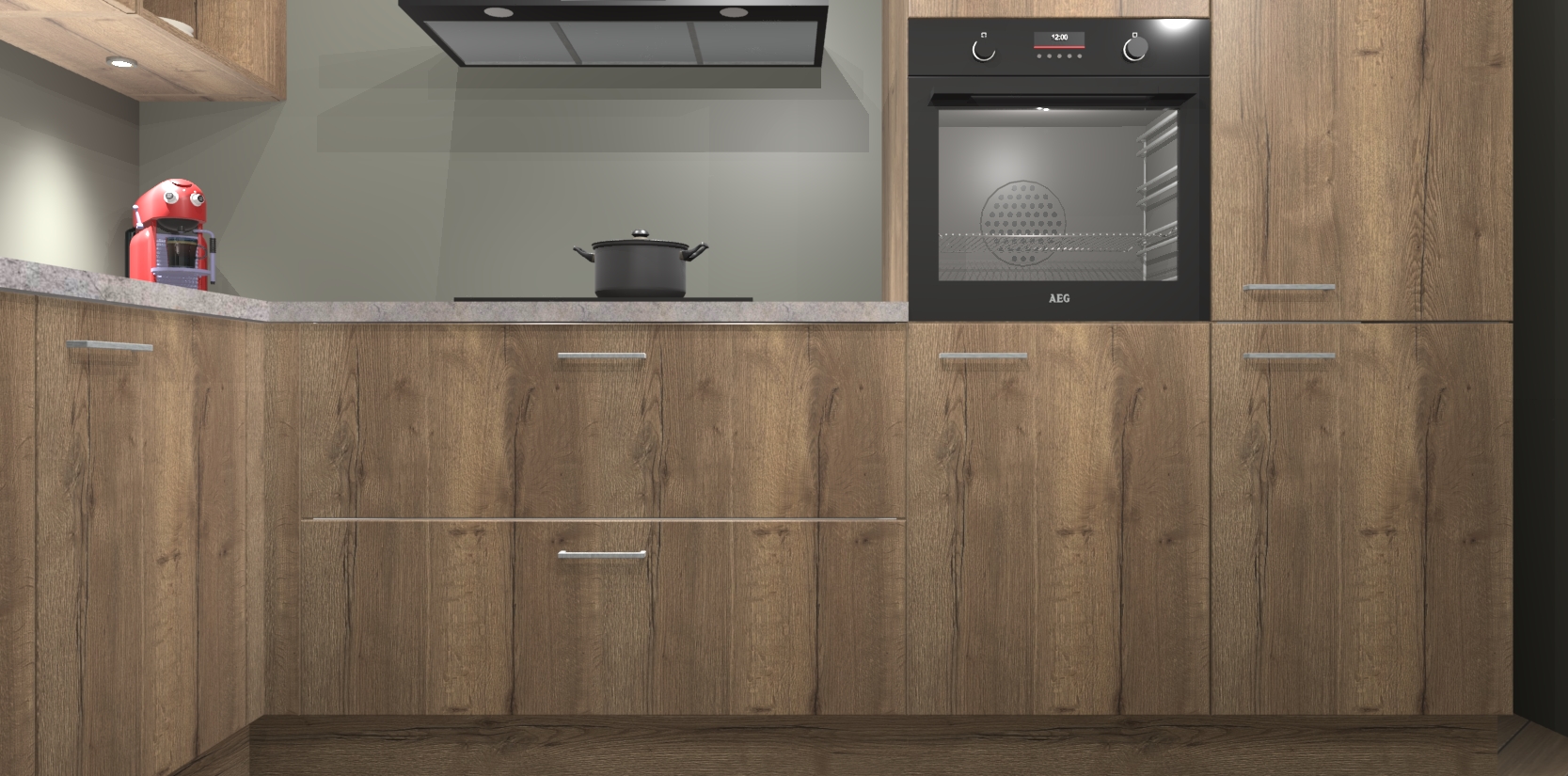 De Chocolade Eiken keuken Cognac is een adembenemend ontwerp met een modern en tijdloos uiterlijk. Deze luxe keuken straalt echt aristocratisch uit, waardoor uw koken plezieriger zal worden! Het prachtige design begint bij de hoekkeuken, wat perfect past bij elk type interieur. Bovendien bevat deze hoogwaardige set vijf inbouwapparaten - van oven tot koelkast - die via bestelling naar AEG geüpgraded kunnen worden!