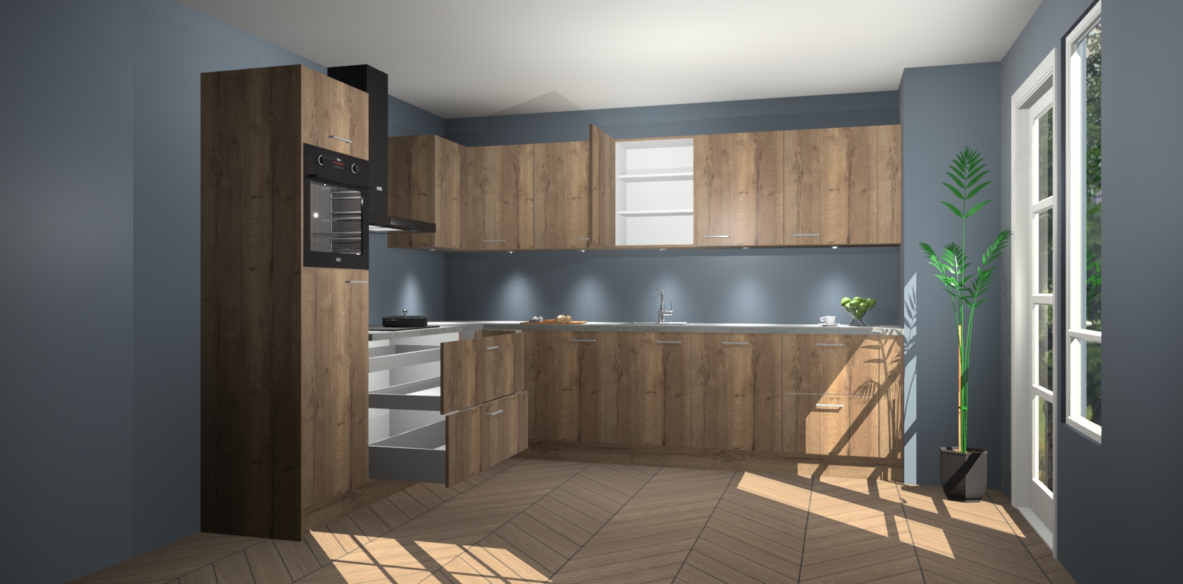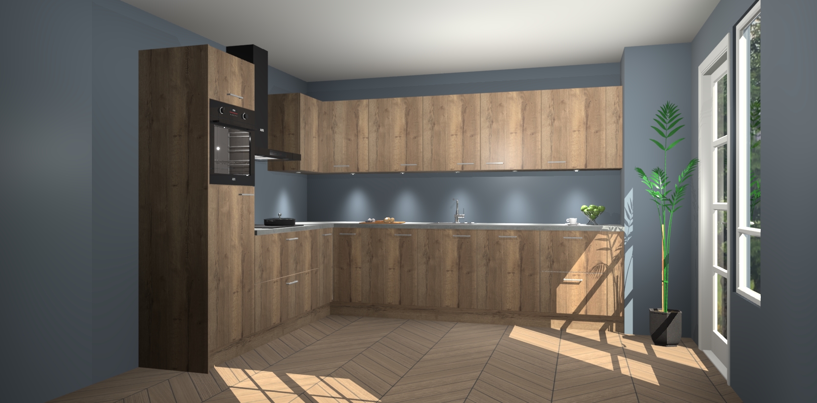 De Chocolade Eiken keuken Debar is uitgerust met vijf inbouwapparaten die elke kooktaak handig en efficiënt maken. Een oven, inductiekookplaat, afzuigkap, vaatwasser en koelkast zijn standaard, maar kunnen na bestelling eenvoudig worden geupgrade naar AEG. Profiteer vervolgens van de softclose deuren voor snelle toegang en geruisloze toegang.