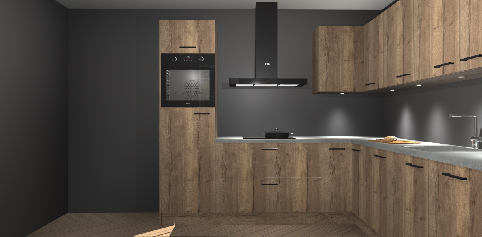 De Chocolade Eiken keuken Debar is uitgerust met vijf inbouwapparaten die elke kooktaak handig en efficiënt maken. Een oven, inductiekookplaat, afzuigkap, vaatwasser en koelkast zijn standaard, maar kunnen na bestelling eenvoudig worden geupgrade naar AEG. Profiteer vervolgens van de softclose deuren voor snelle toegang en geruisloze toegang.