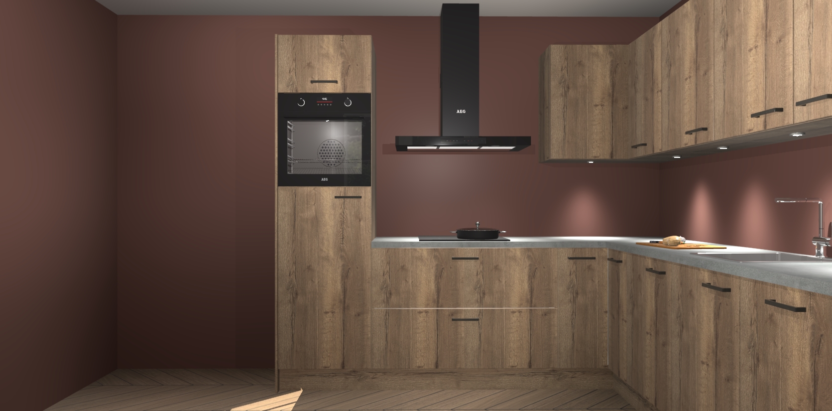 De Chocolade Eiken keuken Debar is uitgerust met vijf inbouwapparaten die elke kooktaak handig en efficiënt maken. Een oven, inductiekookplaat, afzuigkap, vaatwasser en koelkast zijn standaard, maar kunnen na bestelling eenvoudig worden geupgrade naar AEG. Profiteer vervolgens van de softclose deuren voor snelle toegang en geruisloze toegang.
