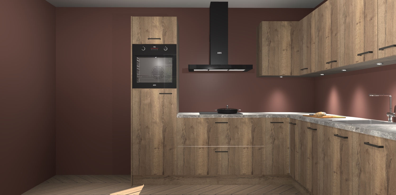 De Chocolade Eiken keuken Debar is uitgerust met vijf inbouwapparaten die elke kooktaak handig en efficiënt maken. Een oven, inductiekookplaat, afzuigkap, vaatwasser en koelkast zijn standaard, maar kunnen na bestelling eenvoudig worden geupgrade naar AEG. Profiteer vervolgens van de softclose deuren voor snelle toegang en geruisloze toegang.