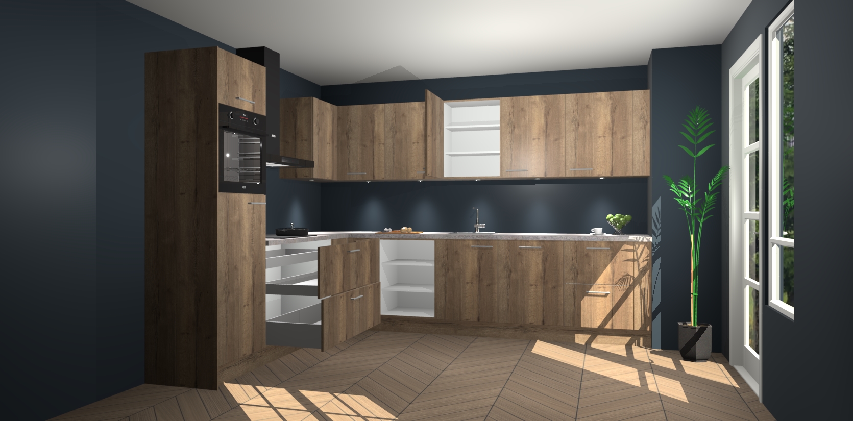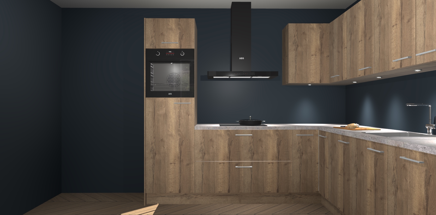 De Chocolade Eiken keuken Debar is uitgerust met vijf inbouwapparaten die elke kooktaak handig en efficiënt maken. Een oven, inductiekookplaat, afzuigkap, vaatwasser en koelkast zijn standaard, maar kunnen na bestelling eenvoudig worden geupgrade naar AEG. Profiteer vervolgens van de softclose deuren voor snelle toegang en geruisloze toegang.