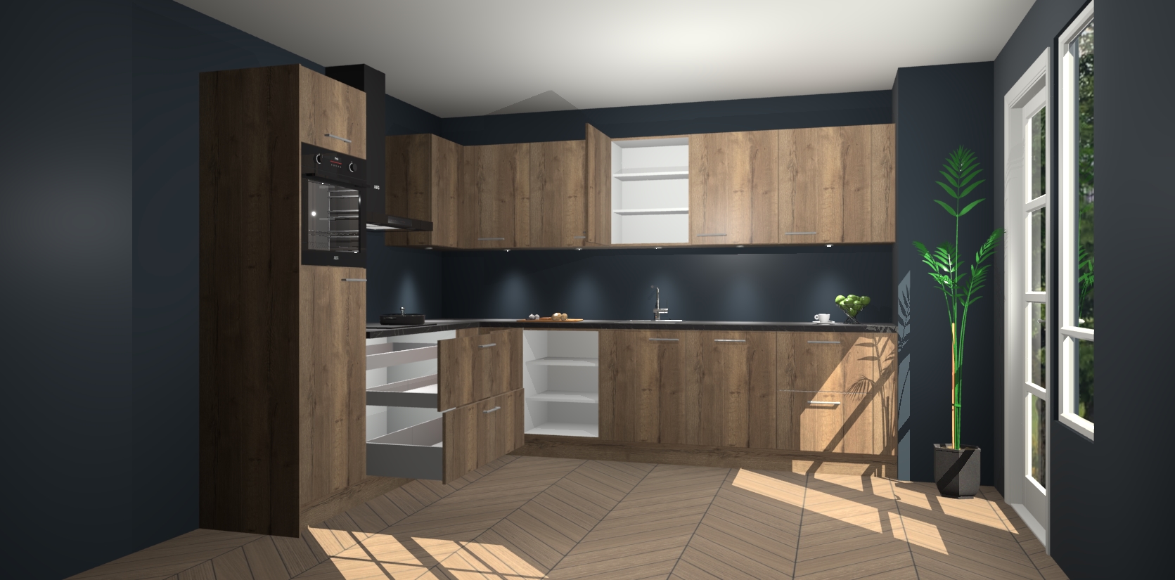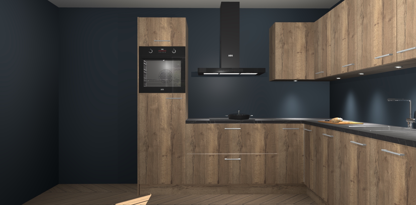 De Chocolade Eiken keuken Debar is uitgerust met vijf inbouwapparaten die elke kooktaak handig en efficiënt maken. Een oven, inductiekookplaat, afzuigkap, vaatwasser en koelkast zijn standaard, maar kunnen na bestelling eenvoudig worden geupgrade naar AEG. Profiteer vervolgens van de softclose deuren voor snelle toegang en geruisloze toegang.
