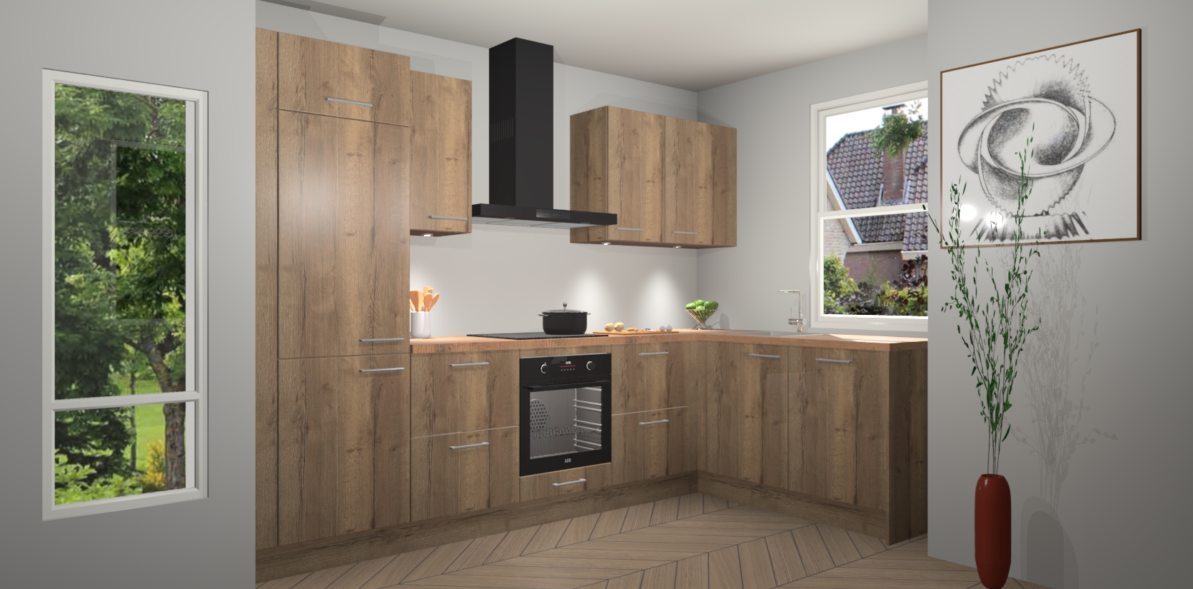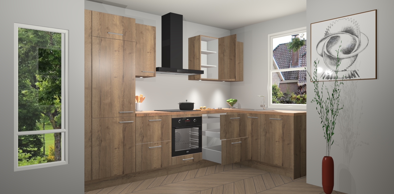 Bent u op zoek naar een moderne en tijdloze keuken die schoonheid in uw huis brengt? Zoek dan niet verder dan de Chocolade Eiken keuken Geneve - de perfecte keuken voor al uw wensen. Deze hoekkeuken biedt de hoogste Duitse kwaliteit voor een vaste lage prijs en is zeker een blikvanger in uw huis!