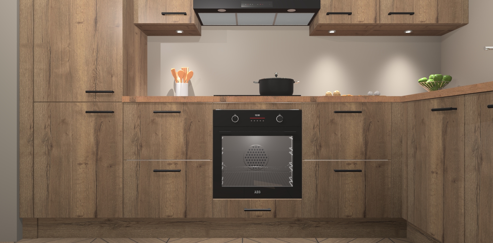 De Chocolade Eiken keuken Geneve is uitgerust met 5 inbouwapparaten - een oven, inductiekookplaat, afzuigkap, vaatwasser en koelkast - voor al uw kook- en bewaarbehoeftes. U kunt deze apparaten desgewenst eenvoudig upgraden naar AEG of de oven omruilen voor een combimagnetron na het plaatsen van uw bestelling. En met de soft close deuren, voldoende opbergruimte en kasten die voorgemonteerd worden geleverd, bent u in een mum van tijd klaar om heerlijke maaltijden te bereiden!