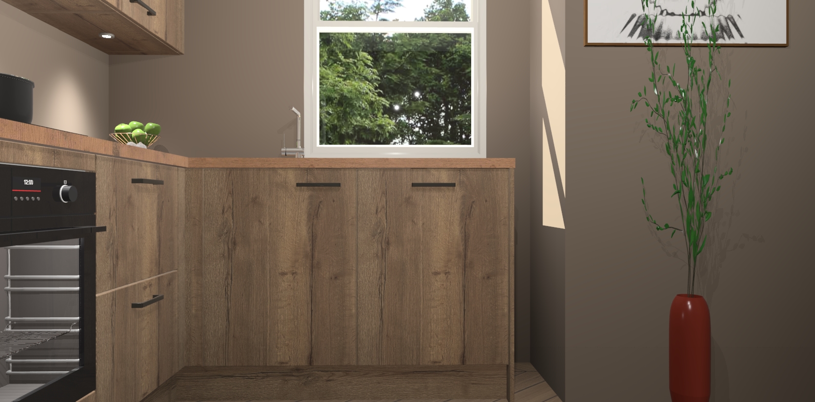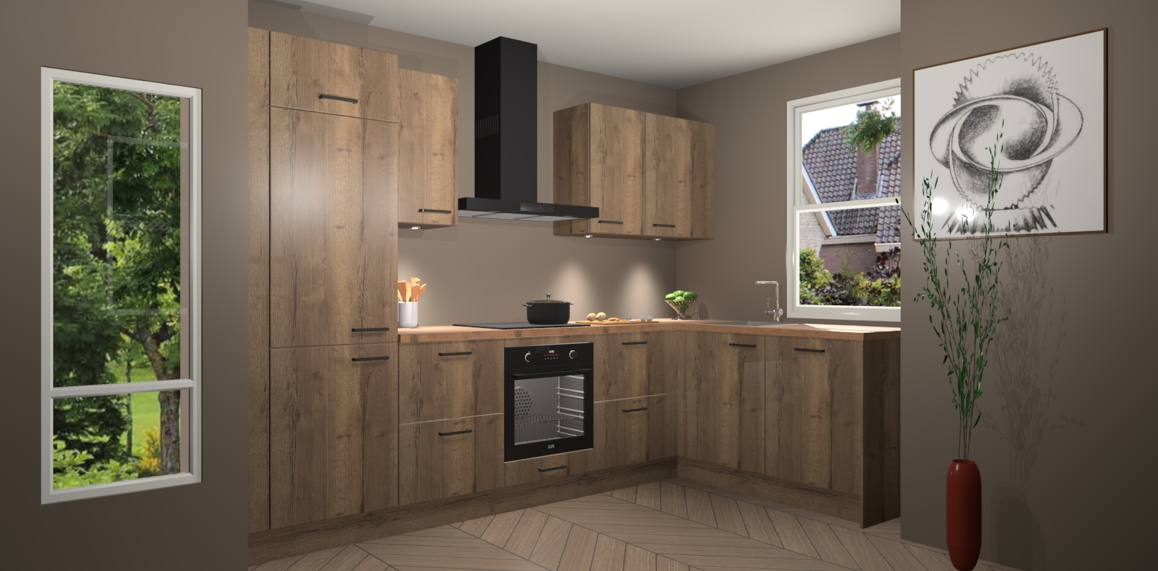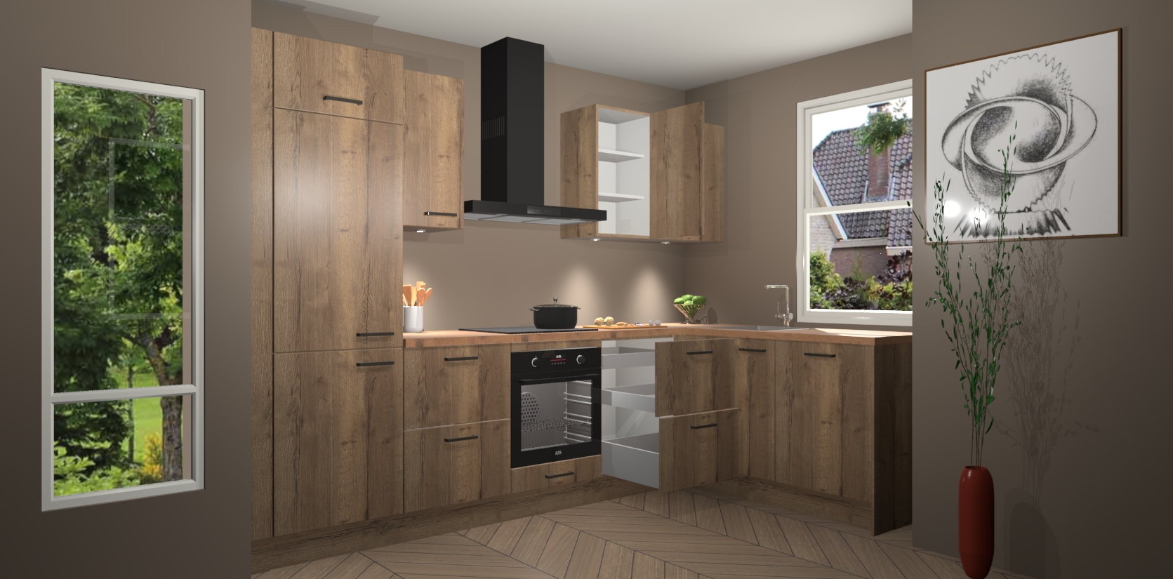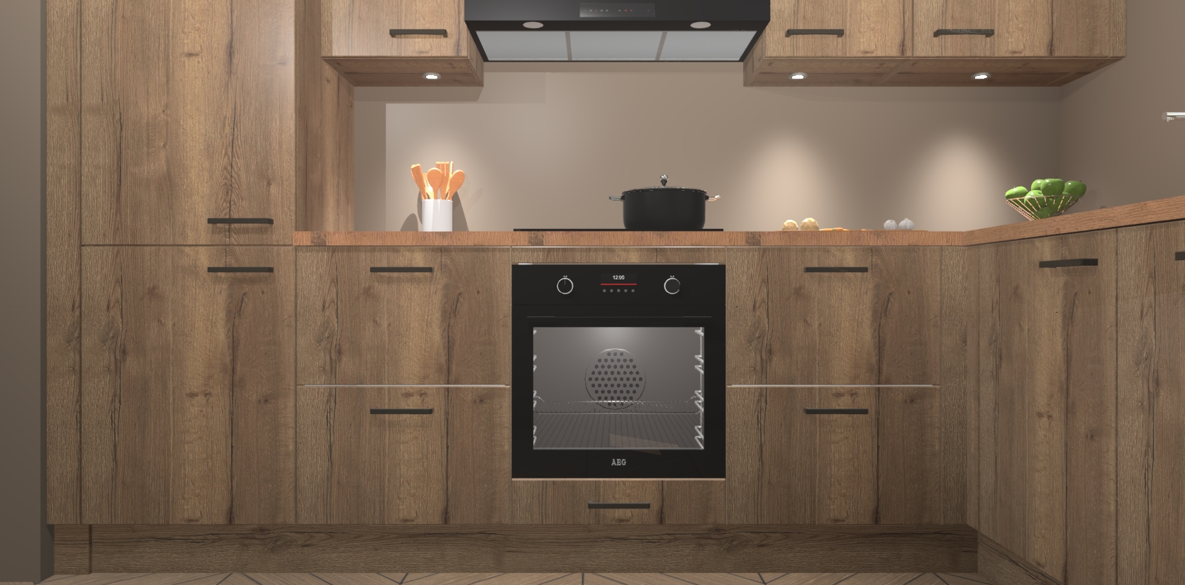 De Chocolade Eiken keuken Geneve is uitgerust met 5 inbouwapparaten - een oven, inductiekookplaat, afzuigkap, vaatwasser en koelkast - voor al uw kook- en bewaarbehoeftes. U kunt deze apparaten desgewenst eenvoudig upgraden naar AEG of de oven omruilen voor een combimagnetron na het plaatsen van uw bestelling. En met de soft close deuren, voldoende opbergruimte en kasten die voorgemonteerd worden geleverd, bent u in een mum van tijd klaar om heerlijke maaltijden te bereiden!