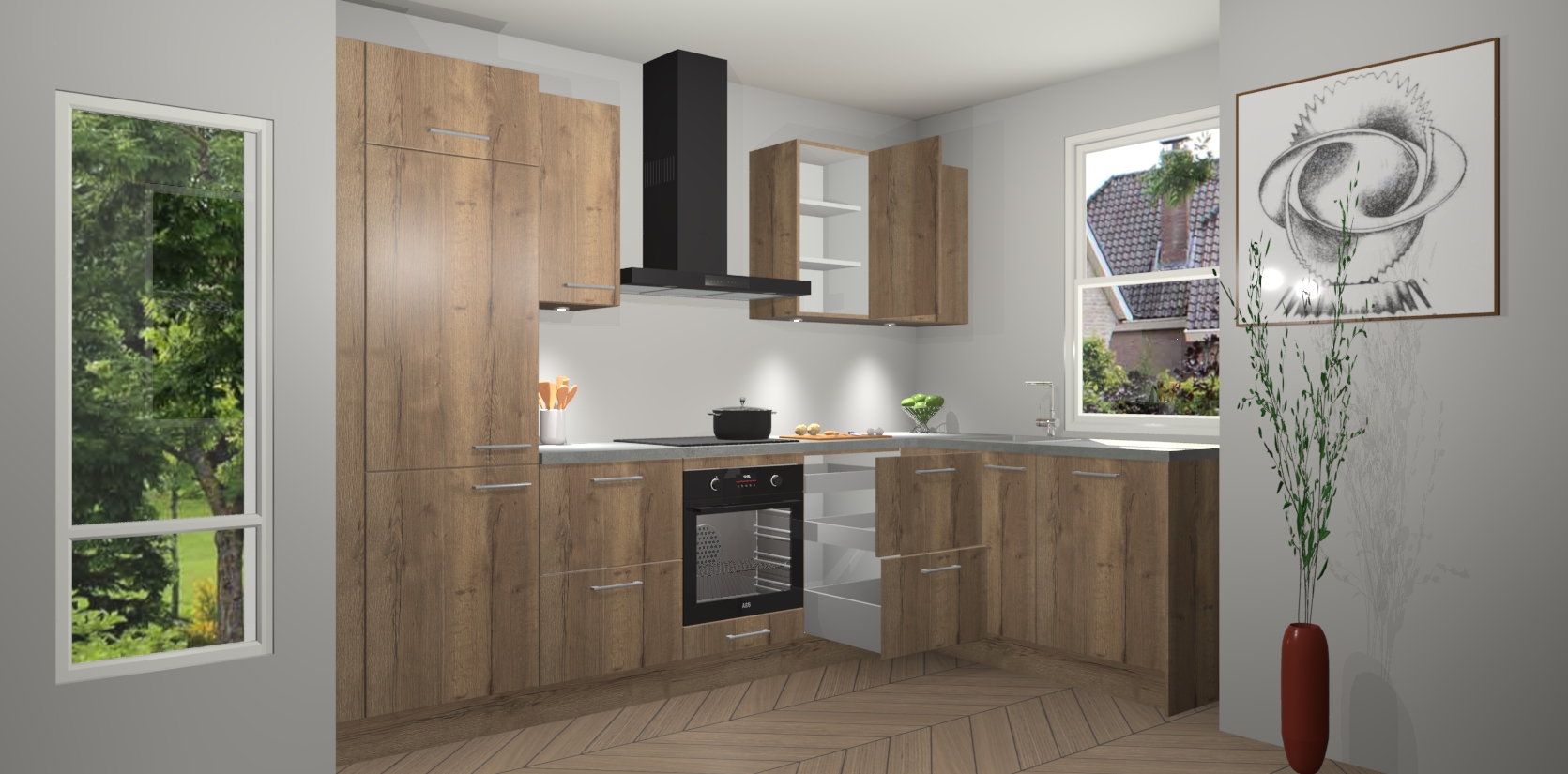 Bent u op zoek naar een moderne en tijdloze keuken die schoonheid in uw huis brengt? Zoek dan niet verder dan de Chocolade Eiken keuken Geneve - de perfecte keuken voor al uw wensen. Deze hoekkeuken biedt de hoogste Duitse kwaliteit voor een vaste lage prijs en is zeker een blikvanger in uw huis!