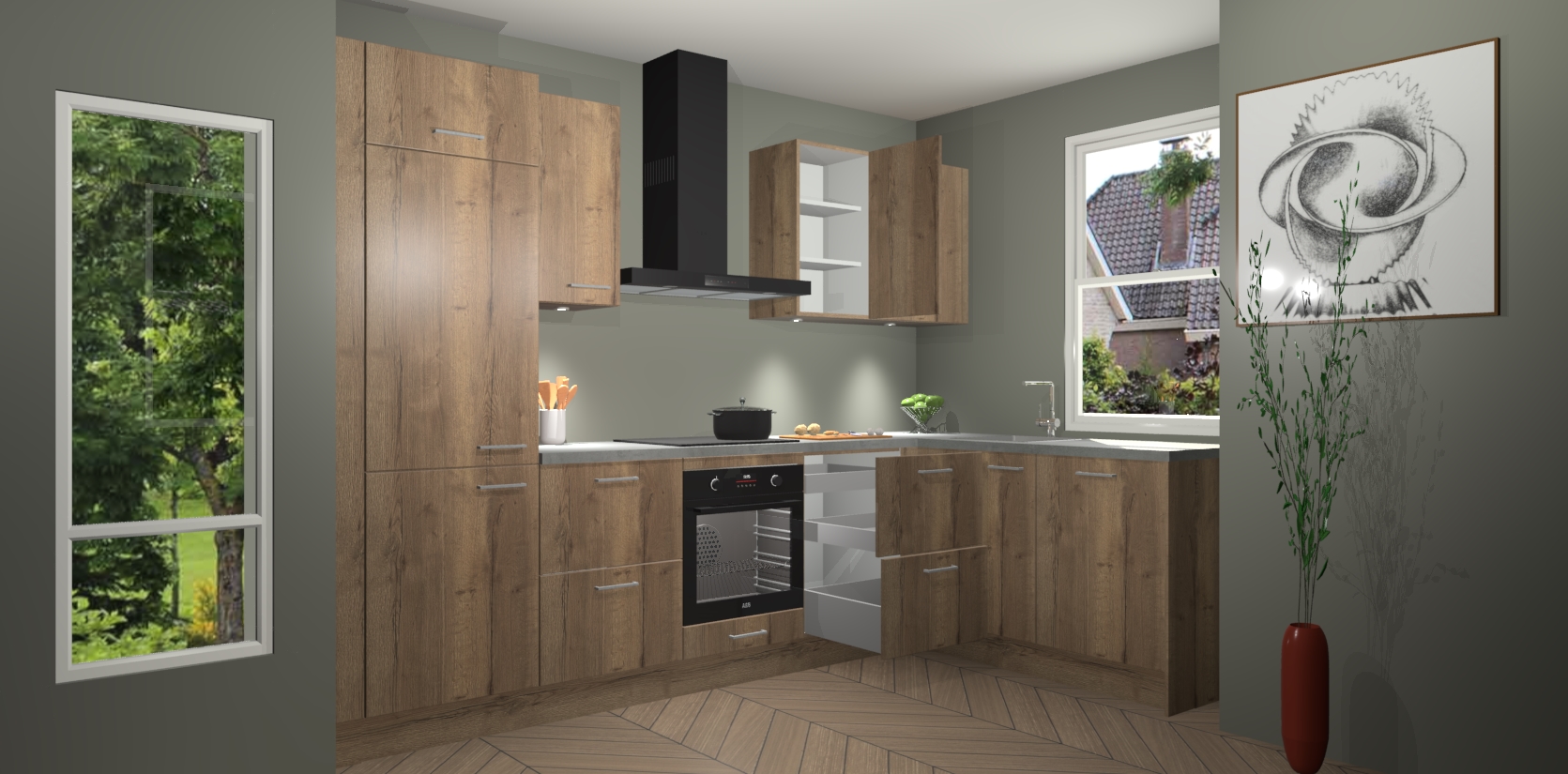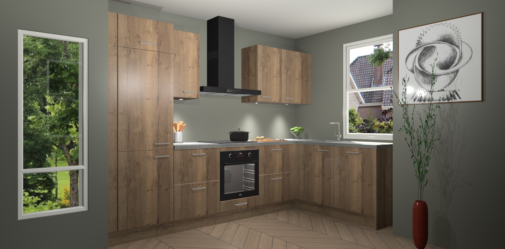 De Chocolade Eiken keuken Geneve is uitgerust met 5 inbouwapparaten - een oven, inductiekookplaat, afzuigkap, vaatwasser en koelkast - voor al uw kook- en bewaarbehoeftes. U kunt deze apparaten desgewenst eenvoudig upgraden naar AEG of de oven omruilen voor een combimagnetron na het plaatsen van uw bestelling. En met de soft close deuren, voldoende opbergruimte en kasten die voorgemonteerd worden geleverd, bent u in een mum van tijd klaar om heerlijke maaltijden te bereiden!