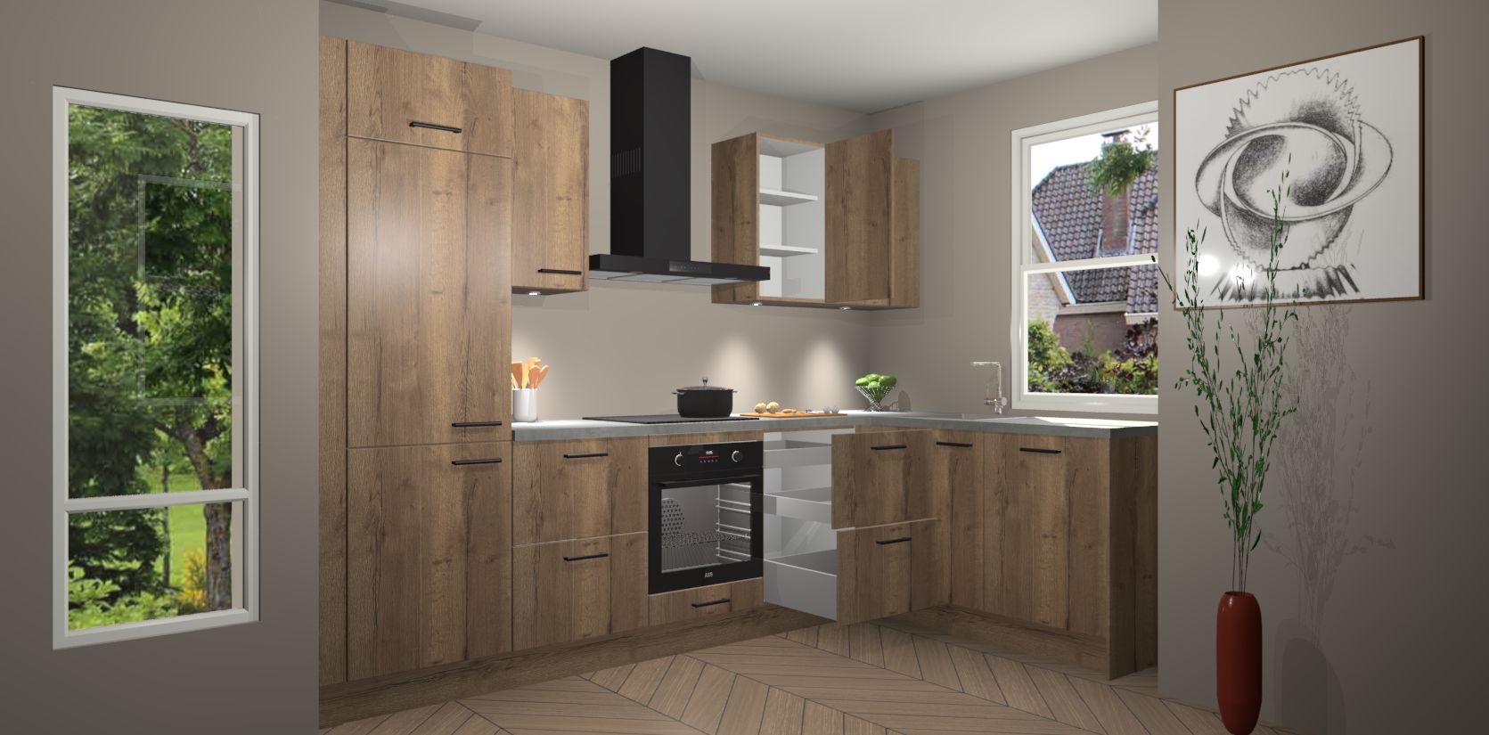 De Chocolade Eiken keuken Geneve is uitgerust met 5 inbouwapparaten - een oven, inductiekookplaat, afzuigkap, vaatwasser en koelkast - voor al uw kook- en bewaarbehoeftes. U kunt deze apparaten desgewenst eenvoudig upgraden naar AEG of de oven omruilen voor een combimagnetron na het plaatsen van uw bestelling. En met de soft close deuren, voldoende opbergruimte en kasten die voorgemonteerd worden geleverd, bent u in een mum van tijd klaar om heerlijke maaltijden te bereiden!