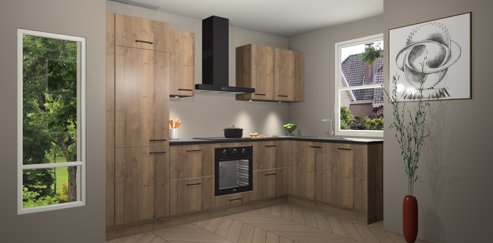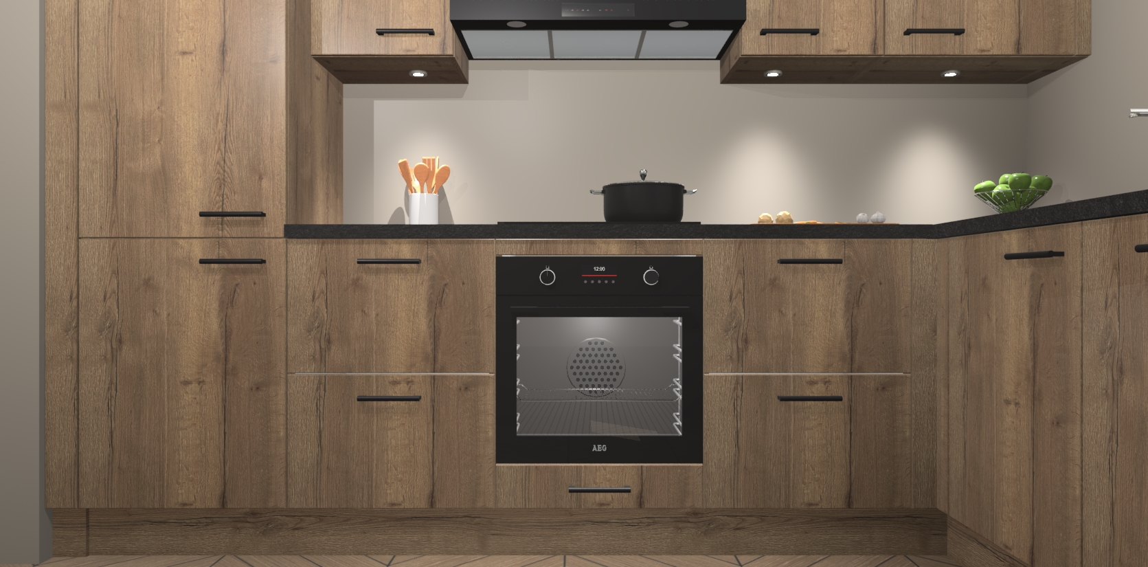 De Chocolade Eiken keuken Geneve is uitgerust met 5 inbouwapparaten - een oven, inductiekookplaat, afzuigkap, vaatwasser en koelkast - voor al uw kook- en bewaarbehoeftes. U kunt deze apparaten desgewenst eenvoudig upgraden naar AEG of de oven omruilen voor een combimagnetron na het plaatsen van uw bestelling. En met de soft close deuren, voldoende opbergruimte en kasten die voorgemonteerd worden geleverd, bent u in een mum van tijd klaar om heerlijke maaltijden te bereiden!