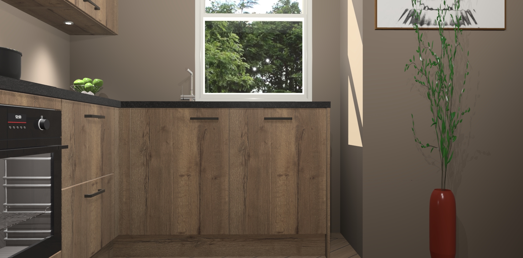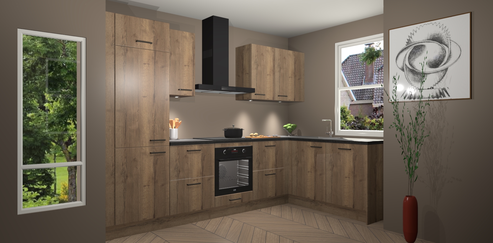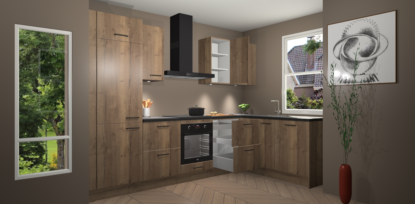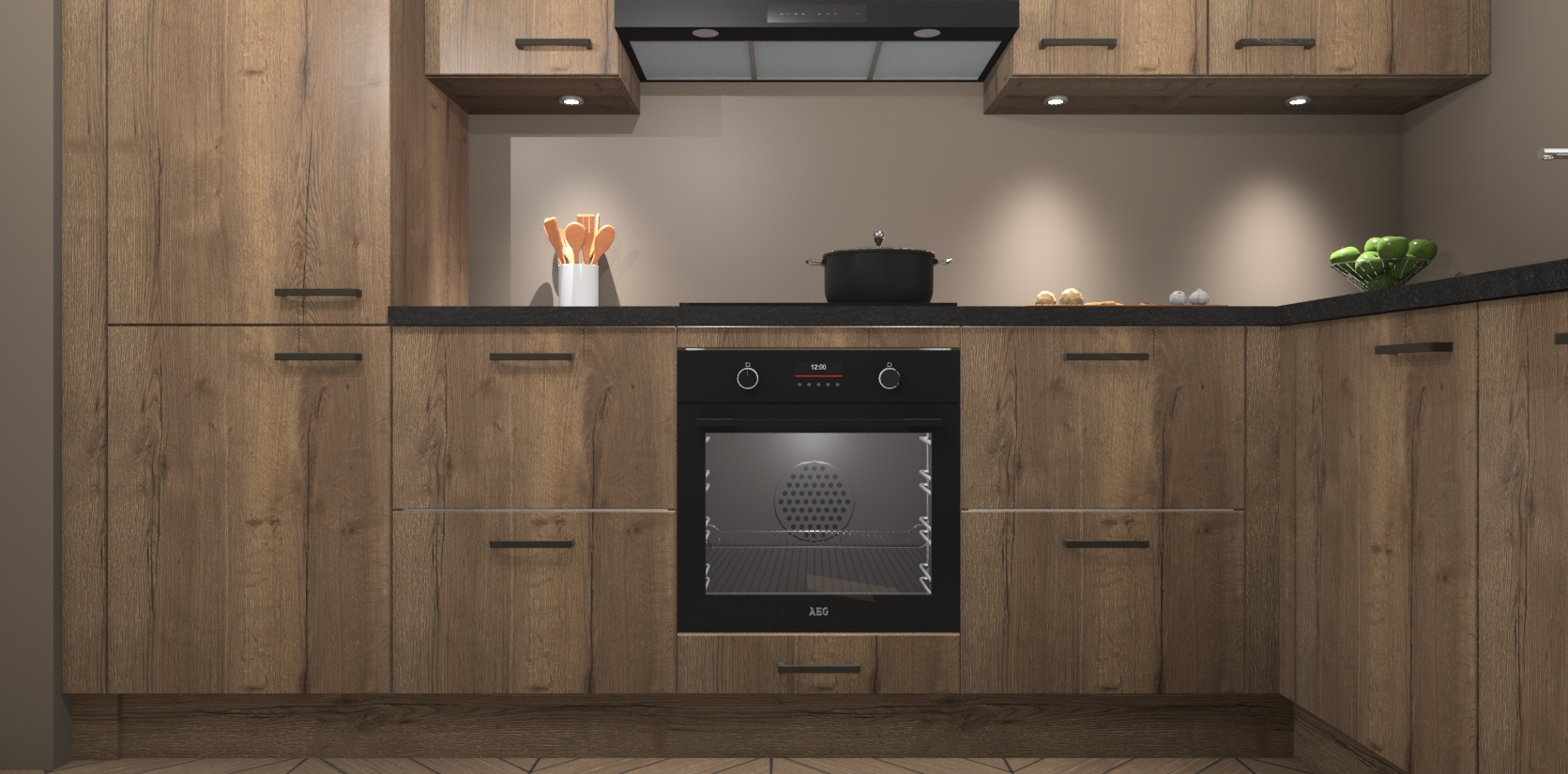 De Chocolade Eiken keuken Geneve is uitgerust met 5 inbouwapparaten - een oven, inductiekookplaat, afzuigkap, vaatwasser en koelkast - voor al uw kook- en bewaarbehoeftes. U kunt deze apparaten desgewenst eenvoudig upgraden naar AEG of de oven omruilen voor een combimagnetron na het plaatsen van uw bestelling. En met de soft close deuren, voldoende opbergruimte en kasten die voorgemonteerd worden geleverd, bent u in een mum van tijd klaar om heerlijke maaltijden te bereiden!
