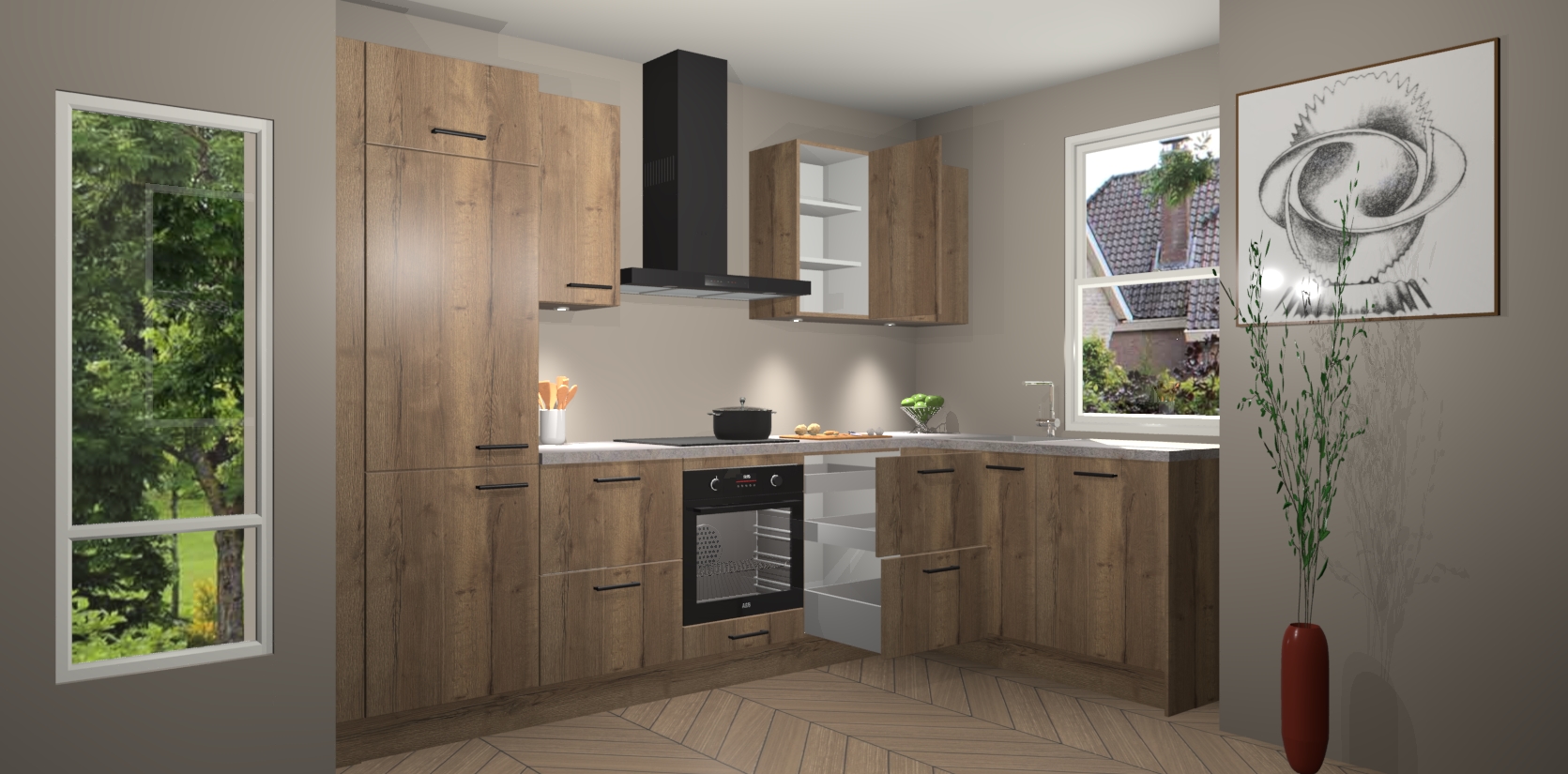 Bent u op zoek naar een moderne en tijdloze keuken die schoonheid in uw huis brengt? Zoek dan niet verder dan de Chocolade Eiken keuken Geneve - de perfecte keuken voor al uw wensen. Deze hoekkeuken biedt de hoogste Duitse kwaliteit voor een vaste lage prijs en is zeker een blikvanger in uw huis!