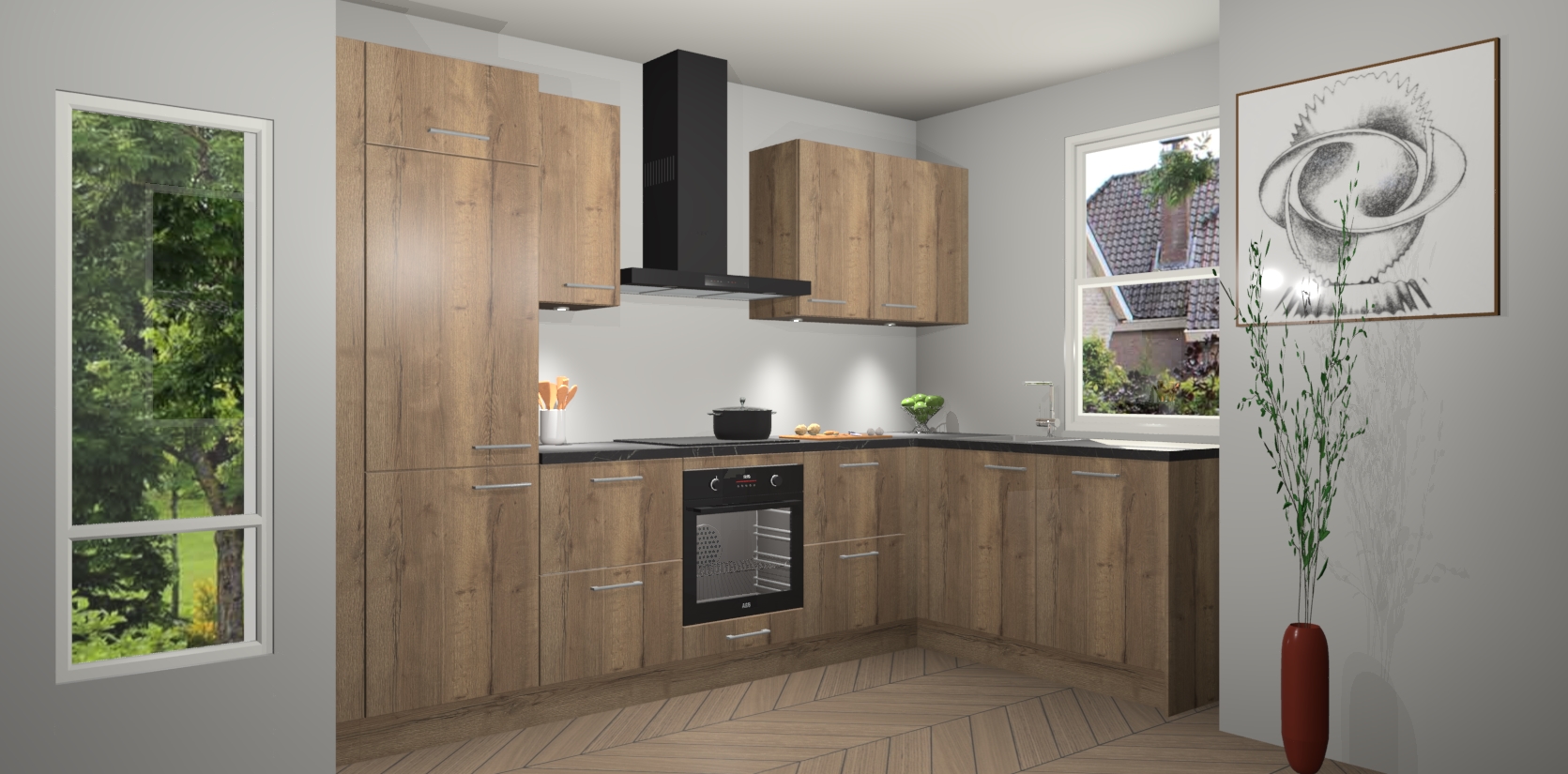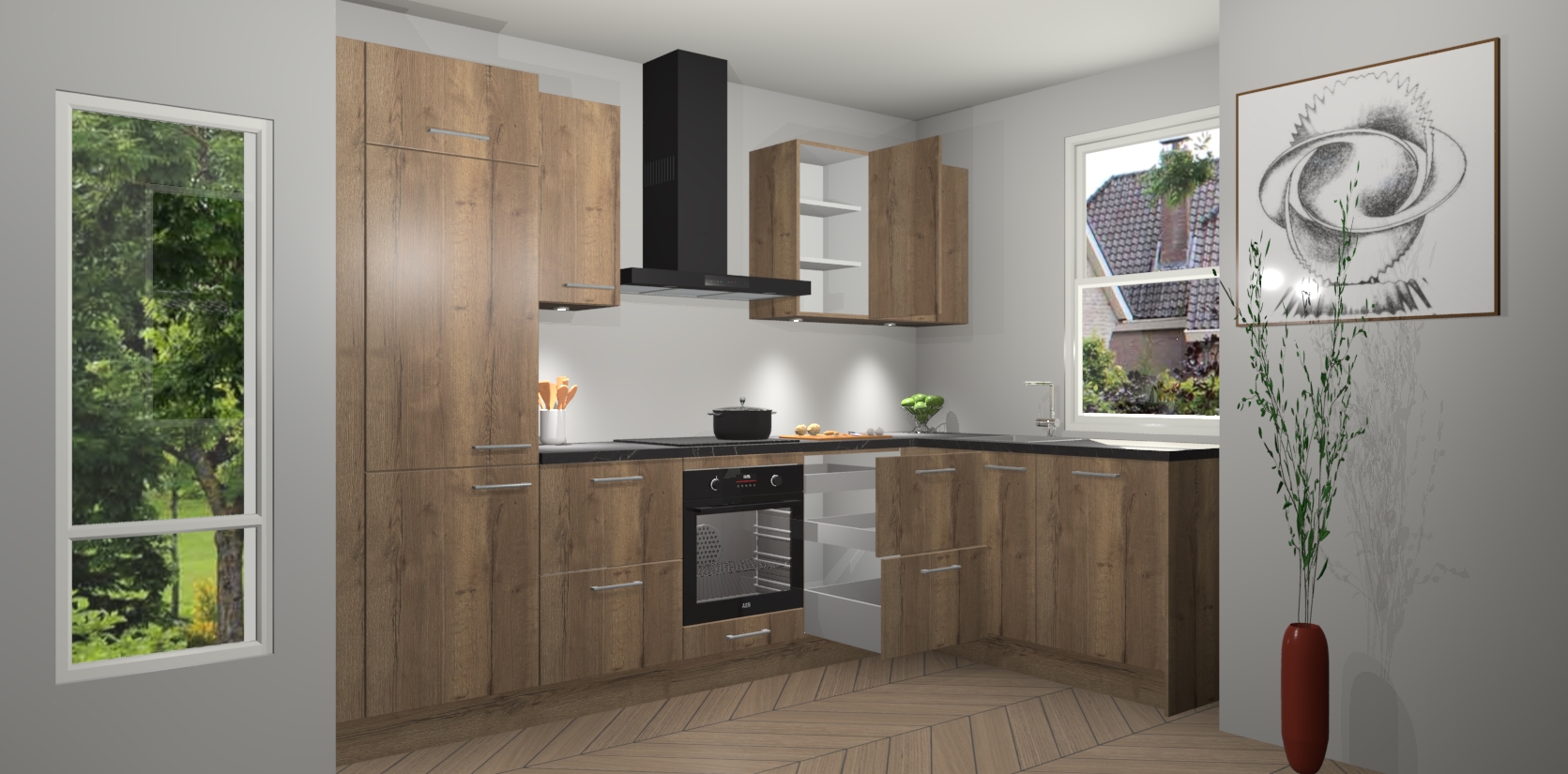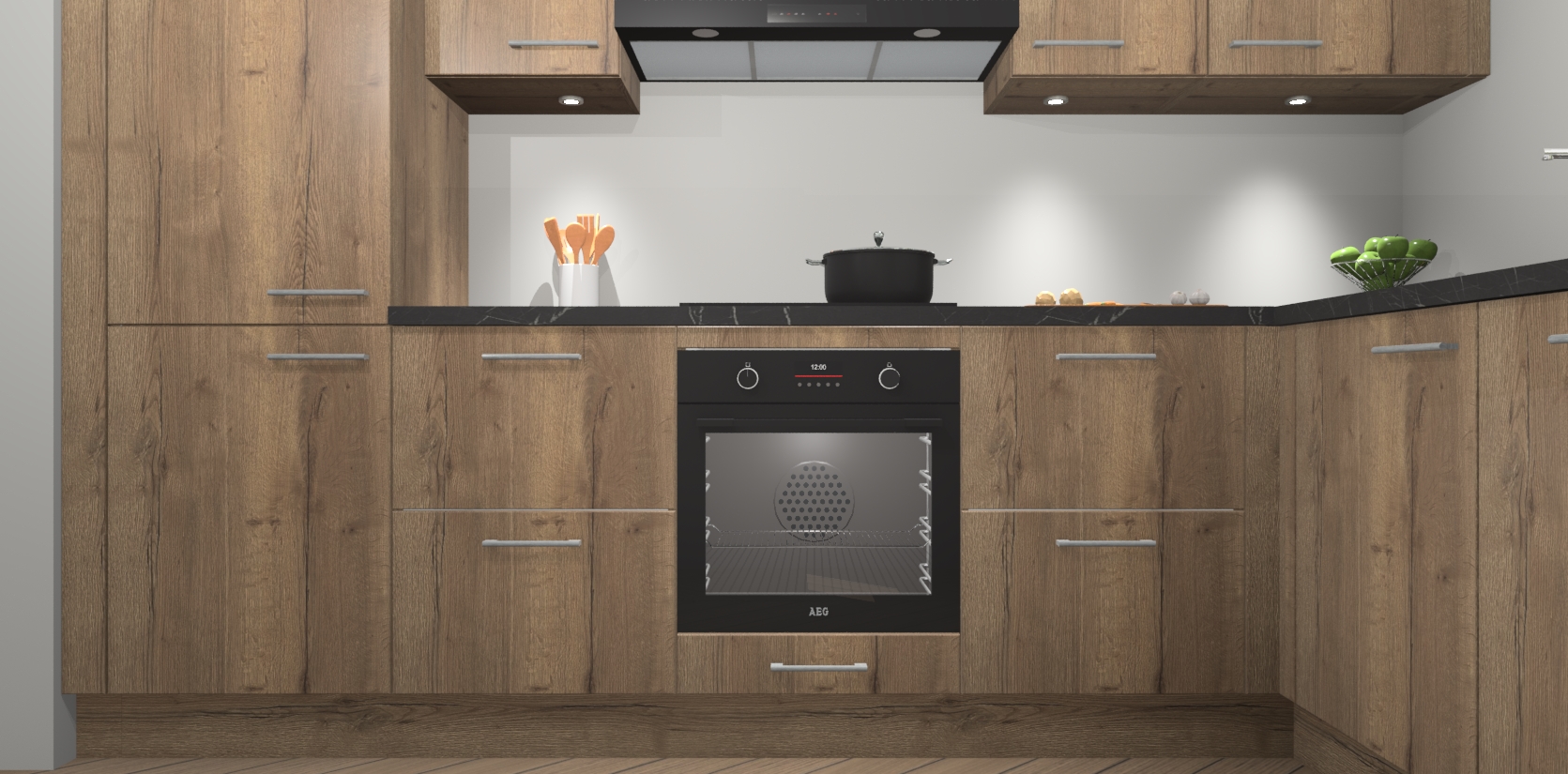 De Chocolade Eiken keuken Geneve is uitgerust met 5 inbouwapparaten - een oven, inductiekookplaat, afzuigkap, vaatwasser en koelkast - voor al uw kook- en bewaarbehoeftes. U kunt deze apparaten desgewenst eenvoudig upgraden naar AEG of de oven omruilen voor een combimagnetron na het plaatsen van uw bestelling. En met de soft close deuren, voldoende opbergruimte en kasten die voorgemonteerd worden geleverd, bent u in een mum van tijd klaar om heerlijke maaltijden te bereiden!