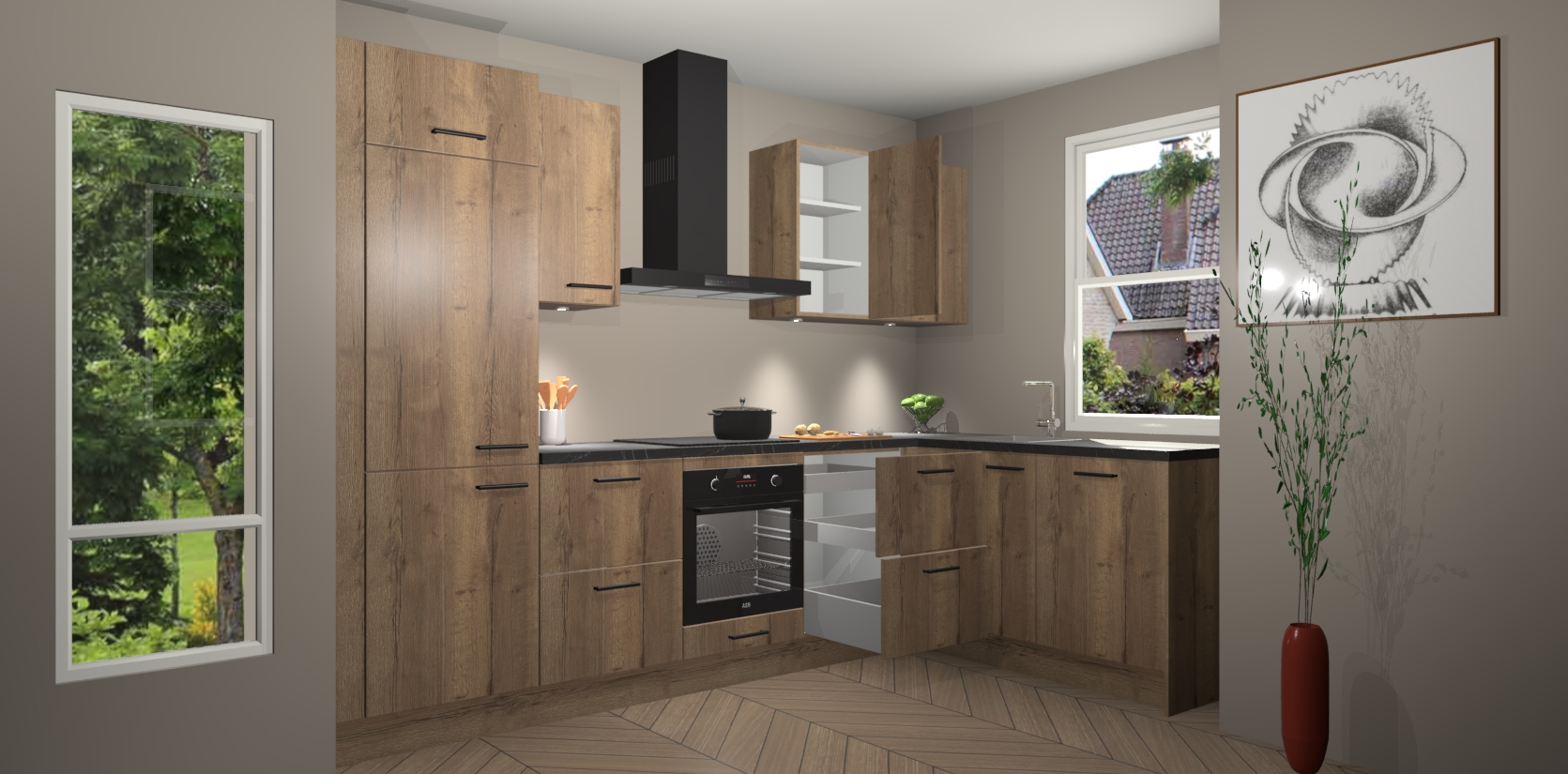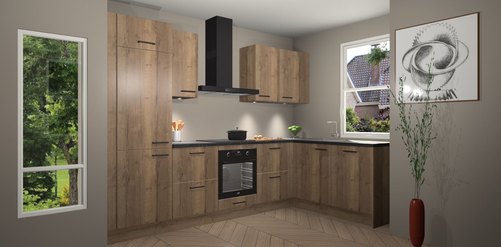 De Chocolade Eiken keuken Geneve is uitgerust met 5 inbouwapparaten - een oven, inductiekookplaat, afzuigkap, vaatwasser en koelkast - voor al uw kook- en bewaarbehoeftes. U kunt deze apparaten desgewenst eenvoudig upgraden naar AEG of de oven omruilen voor een combimagnetron na het plaatsen van uw bestelling. En met de soft close deuren, voldoende opbergruimte en kasten die voorgemonteerd worden geleverd, bent u in een mum van tijd klaar om heerlijke maaltijden te bereiden!