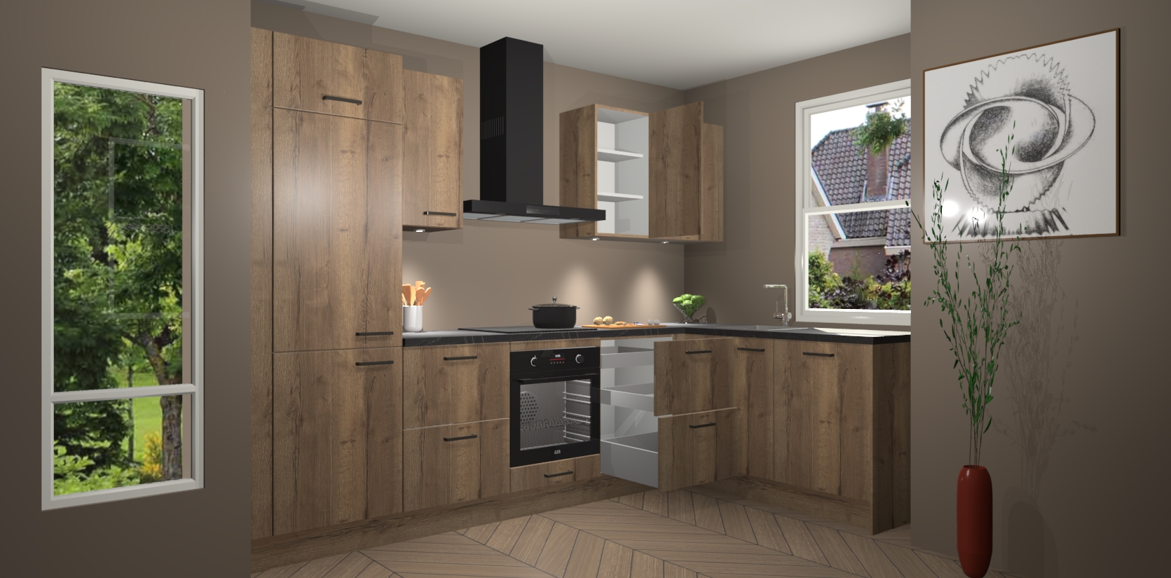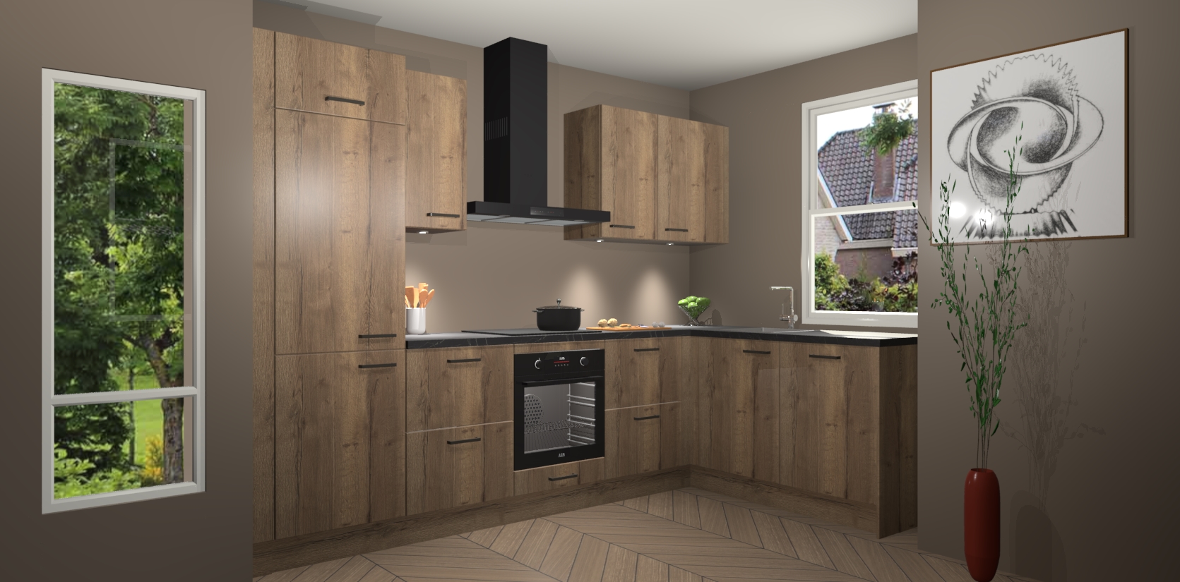 Bent u op zoek naar een moderne en tijdloze keuken die schoonheid in uw huis brengt? Zoek dan niet verder dan de Chocolade Eiken keuken Geneve - de perfecte keuken voor al uw wensen. Deze hoekkeuken biedt de hoogste Duitse kwaliteit voor een vaste lage prijs en is zeker een blikvanger in uw huis!