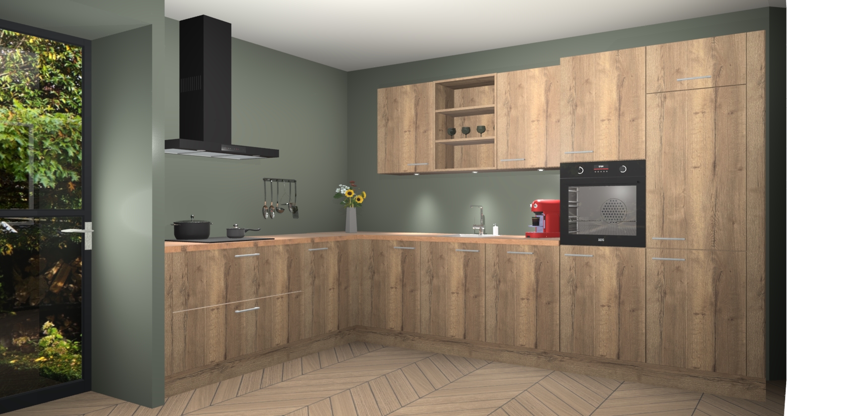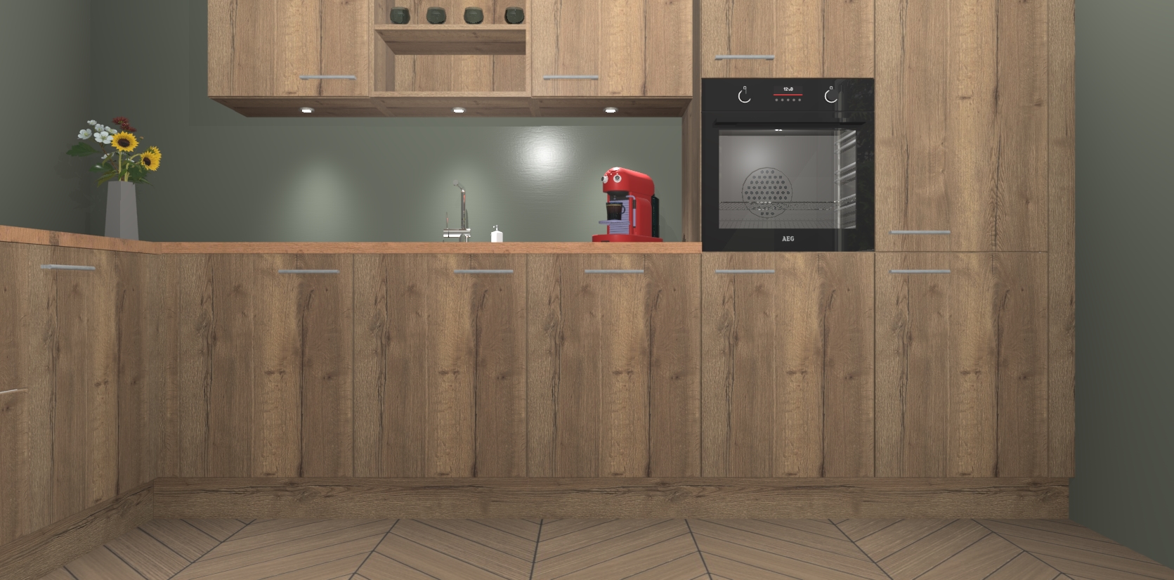 De Chocolade Eiken keuken Gotenburg is zo ontworpen dat u alle mogelijke vormen van opslagruimte kunt genieten. Bovendien heeft u meteen toegang tot vijf ingebouwde apparaten: een oven, inductiekookplaat, afzuigkap, vaatwasser en koelkast. Gewoon upgraden naar AEG na bestelling? Dit kan heel gemakkelijk worden geregeld. De deuren sluiten zacht dankzij zachtsluitende scharnieren en ze houden warmte vast terwijl ze uitzonderlijk stil blijven wanneer ze worden geopend of gesloten.