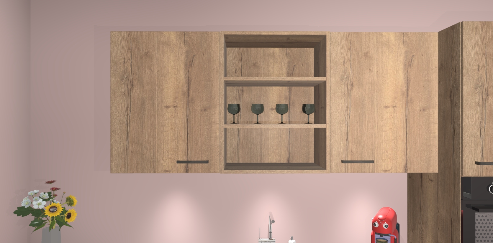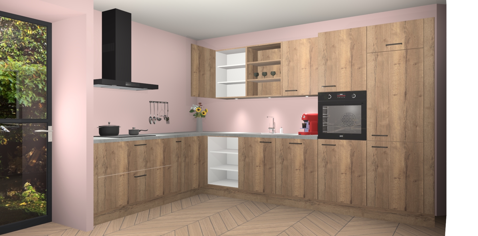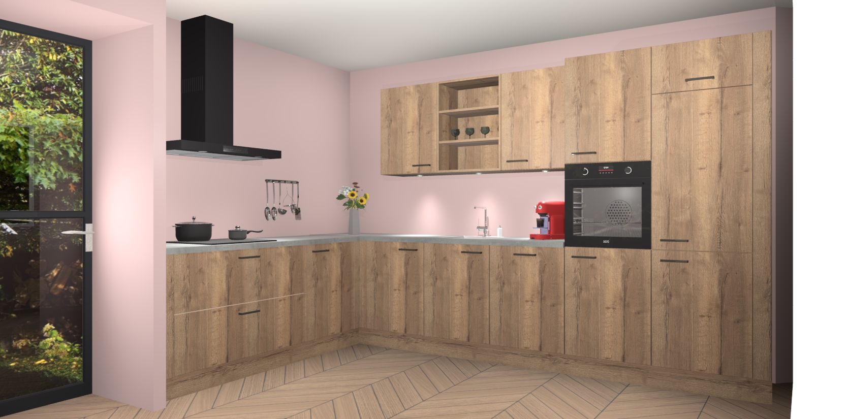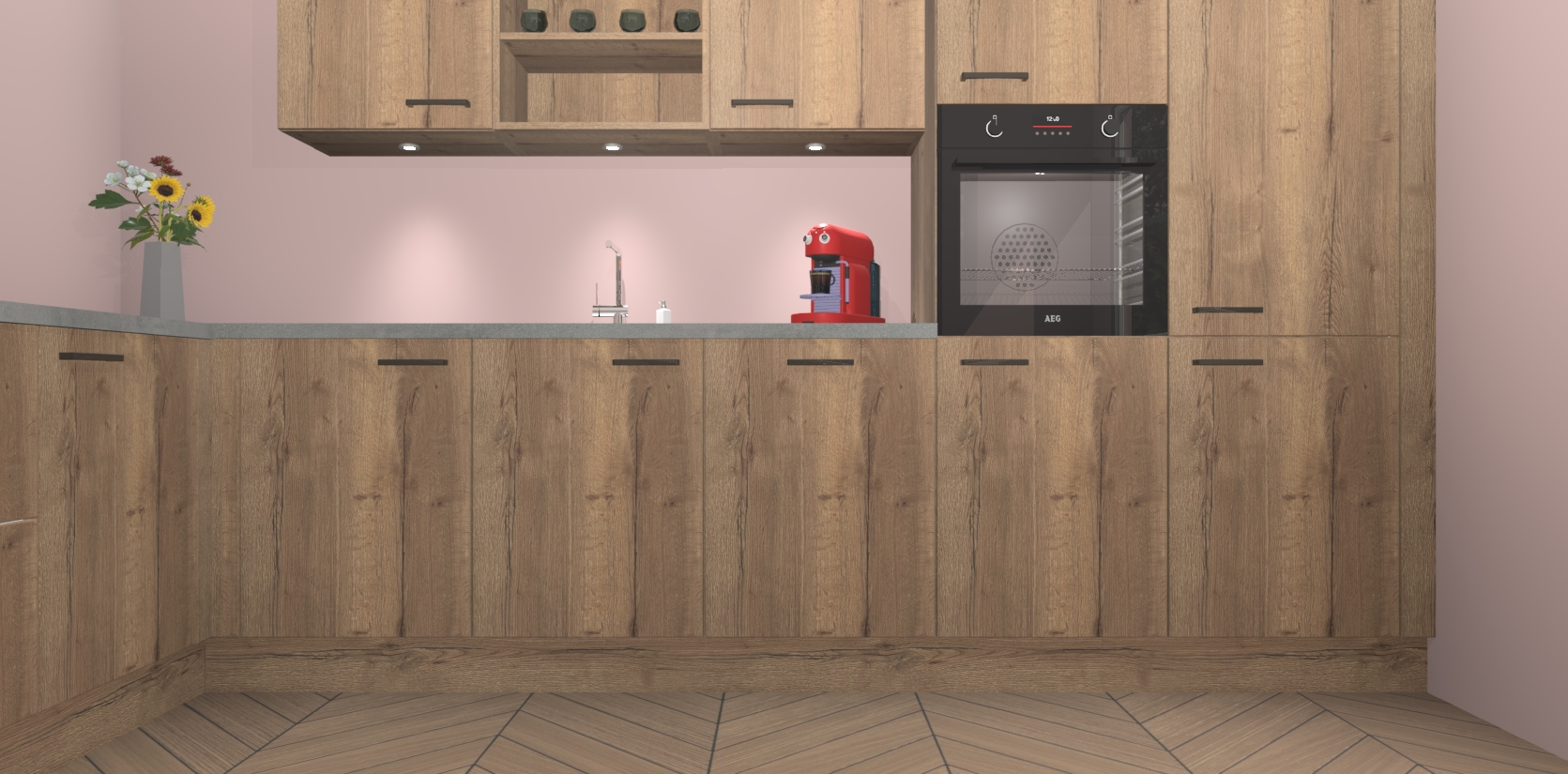 De Chocolade Eiken keuken Gotenburg is zo ontworpen dat u alle mogelijke vormen van opslagruimte kunt genieten. Bovendien heeft u meteen toegang tot vijf ingebouwde apparaten: een oven, inductiekookplaat, afzuigkap, vaatwasser en koelkast. Gewoon upgraden naar AEG na bestelling? Dit kan heel gemakkelijk worden geregeld. De deuren sluiten zacht dankzij zachtsluitende scharnieren en ze houden warmte vast terwijl ze uitzonderlijk stil blijven wanneer ze worden geopend of gesloten.