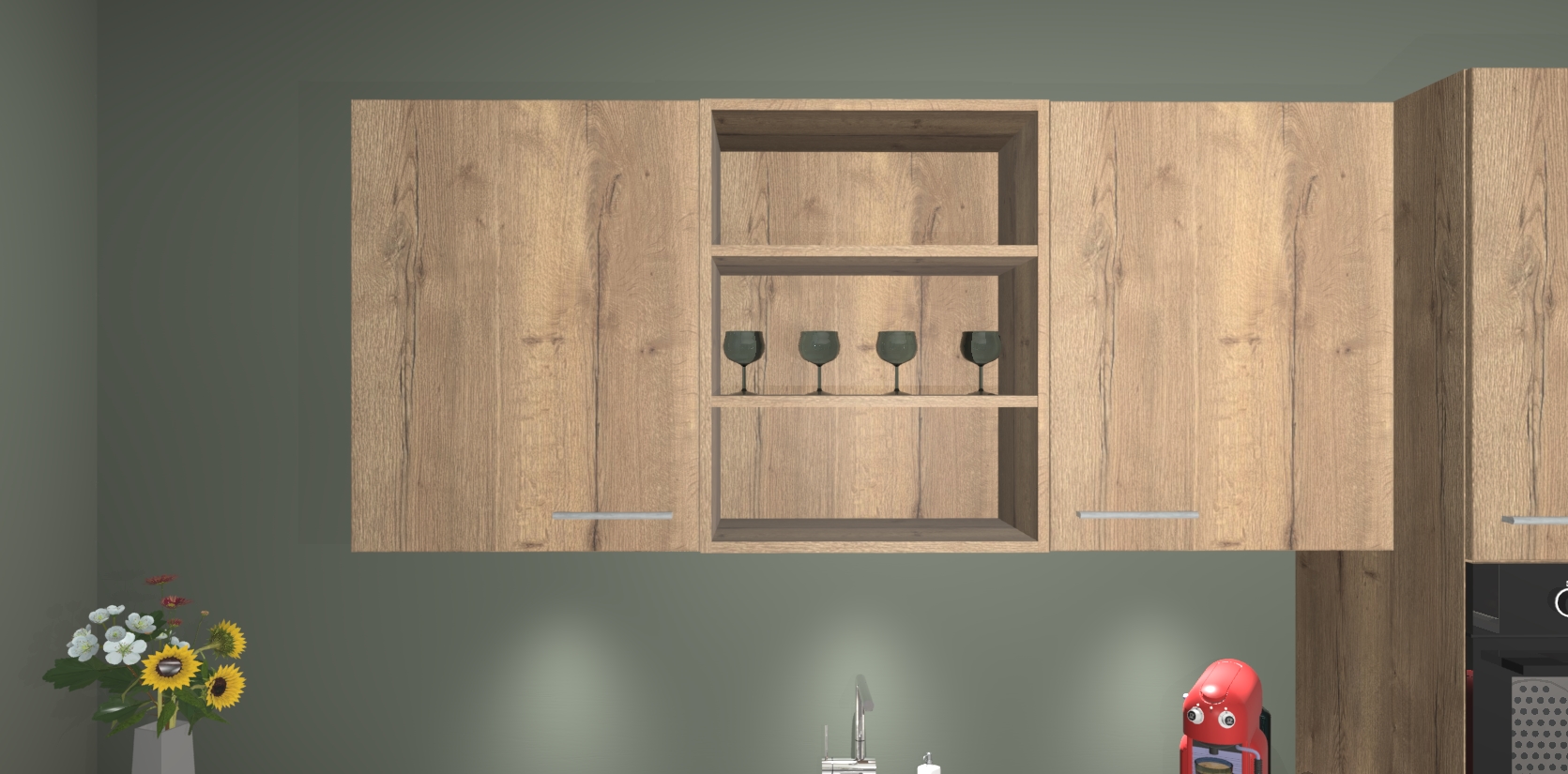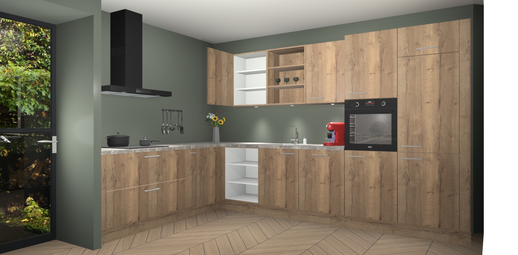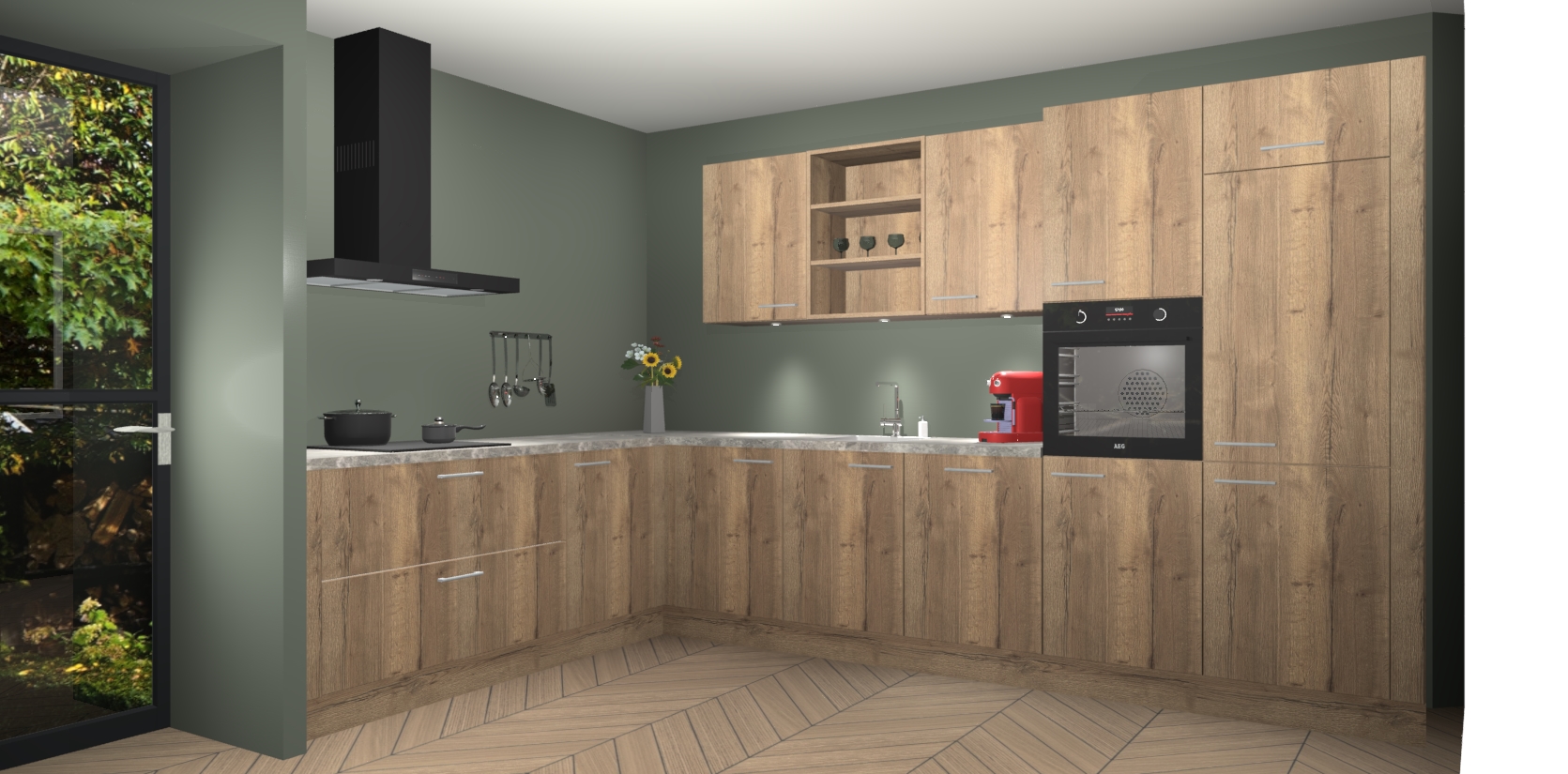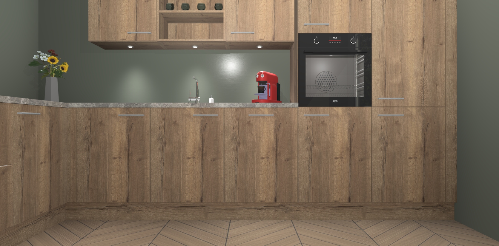 De Chocolade Eiken keuken Gotenburg is zo ontworpen dat u alle mogelijke vormen van opslagruimte kunt genieten. Bovendien heeft u meteen toegang tot vijf ingebouwde apparaten: een oven, inductiekookplaat, afzuigkap, vaatwasser en koelkast. Gewoon upgraden naar AEG na bestelling? Dit kan heel gemakkelijk worden geregeld. De deuren sluiten zacht dankzij zachtsluitende scharnieren en ze houden warmte vast terwijl ze uitzonderlijk stil blijven wanneer ze worden geopend of gesloten.