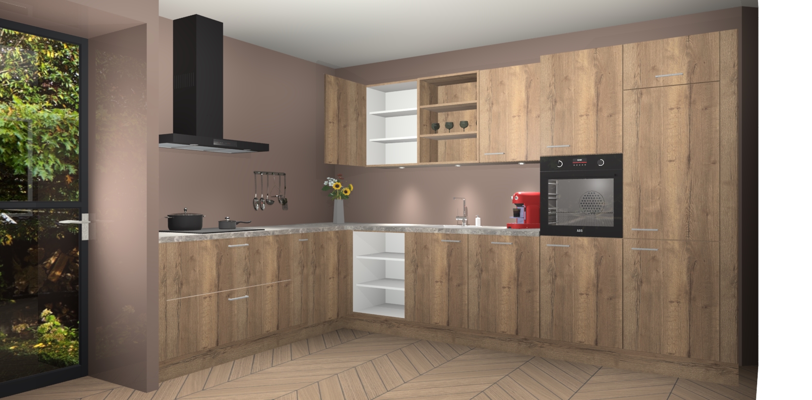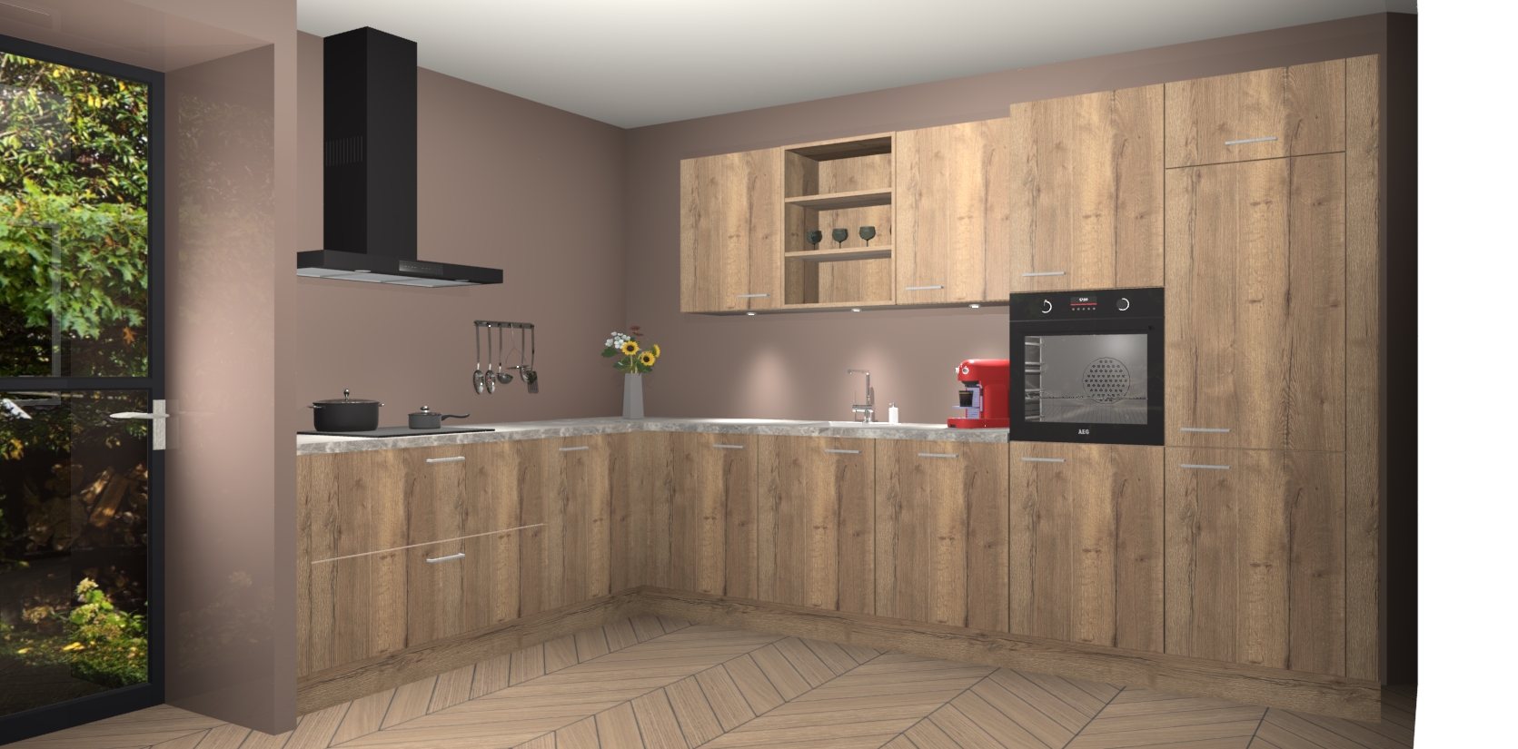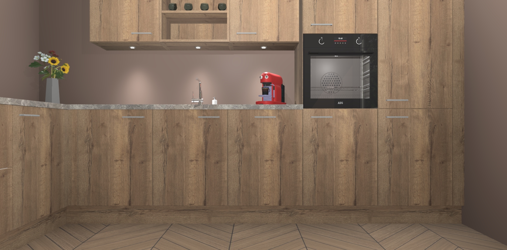 De Chocolade Eiken keuken Gotenburg is zo ontworpen dat u alle mogelijke vormen van opslagruimte kunt genieten. Bovendien heeft u meteen toegang tot vijf ingebouwde apparaten: een oven, inductiekookplaat, afzuigkap, vaatwasser en koelkast. Gewoon upgraden naar AEG na bestelling? Dit kan heel gemakkelijk worden geregeld. De deuren sluiten zacht dankzij zachtsluitende scharnieren en ze houden warmte vast terwijl ze uitzonderlijk stil blijven wanneer ze worden geopend of gesloten.