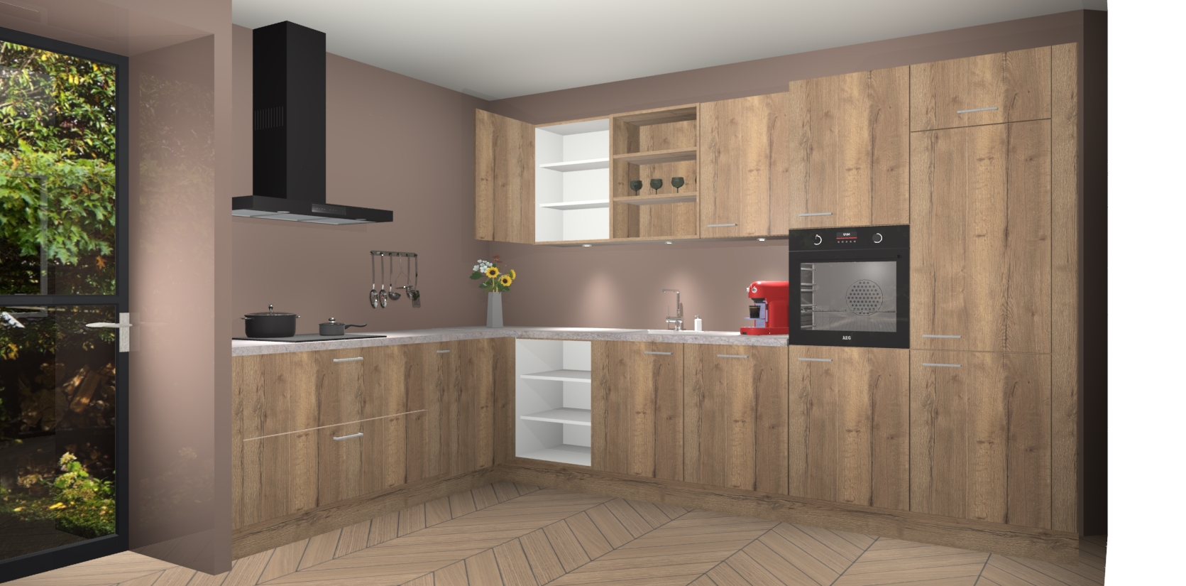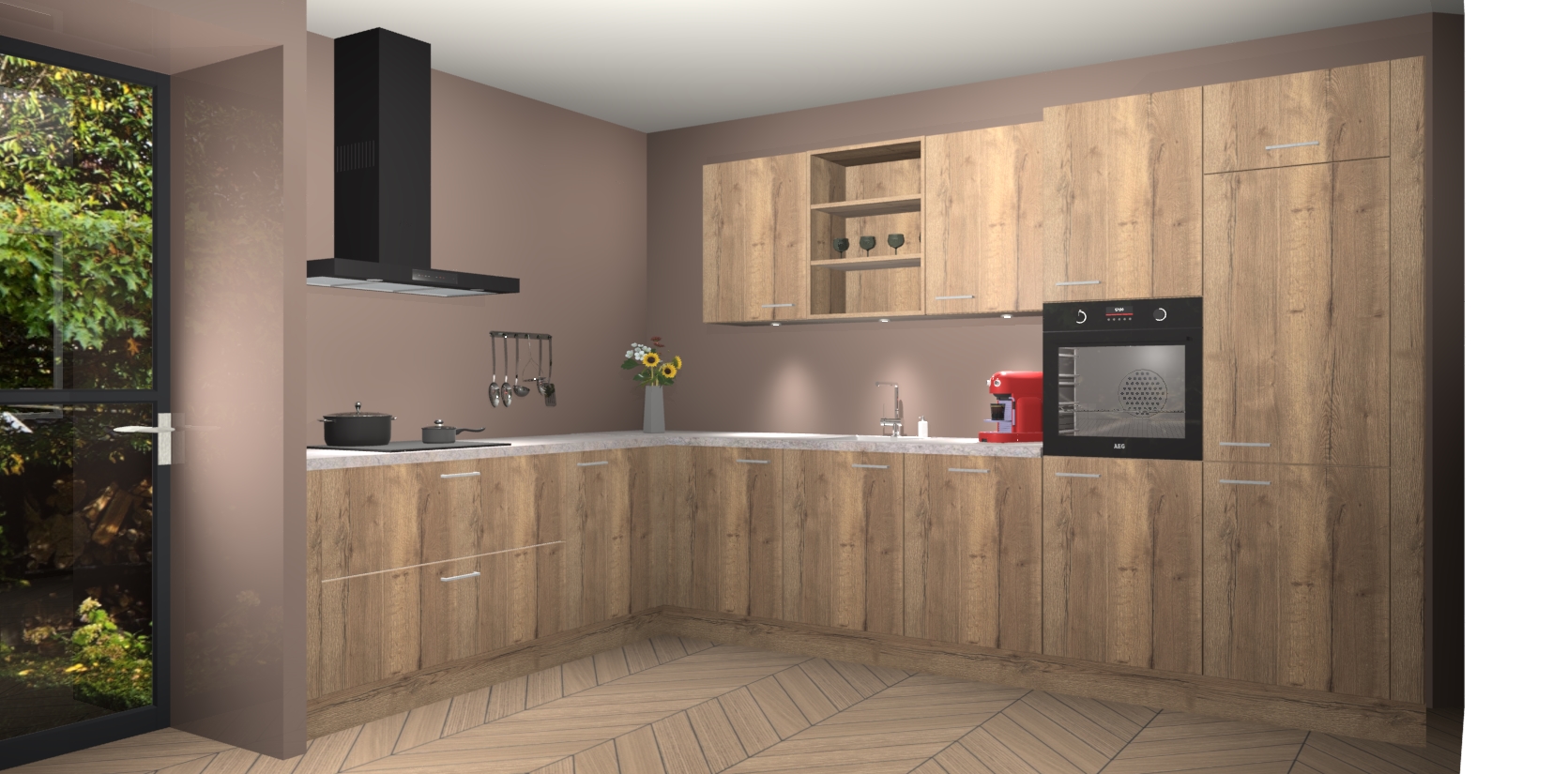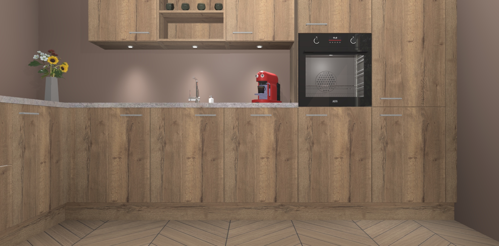 De Chocolade Eiken keuken Gotenburg is zo ontworpen dat u alle mogelijke vormen van opslagruimte kunt genieten. Bovendien heeft u meteen toegang tot vijf ingebouwde apparaten: een oven, inductiekookplaat, afzuigkap, vaatwasser en koelkast. Gewoon upgraden naar AEG na bestelling? Dit kan heel gemakkelijk worden geregeld. De deuren sluiten zacht dankzij zachtsluitende scharnieren en ze houden warmte vast terwijl ze uitzonderlijk stil blijven wanneer ze worden geopend of gesloten.