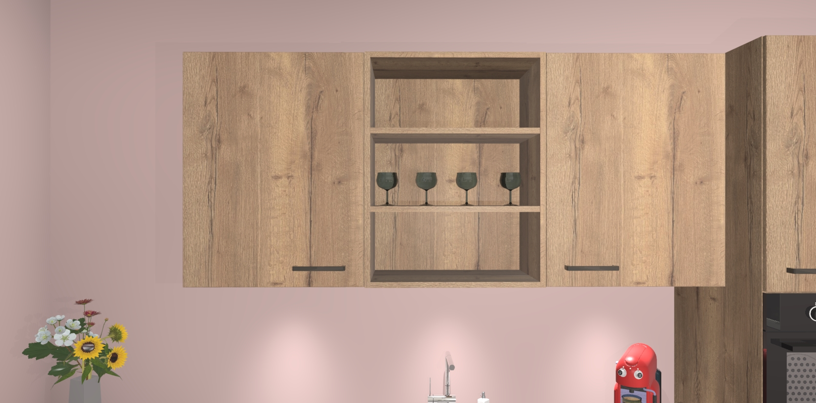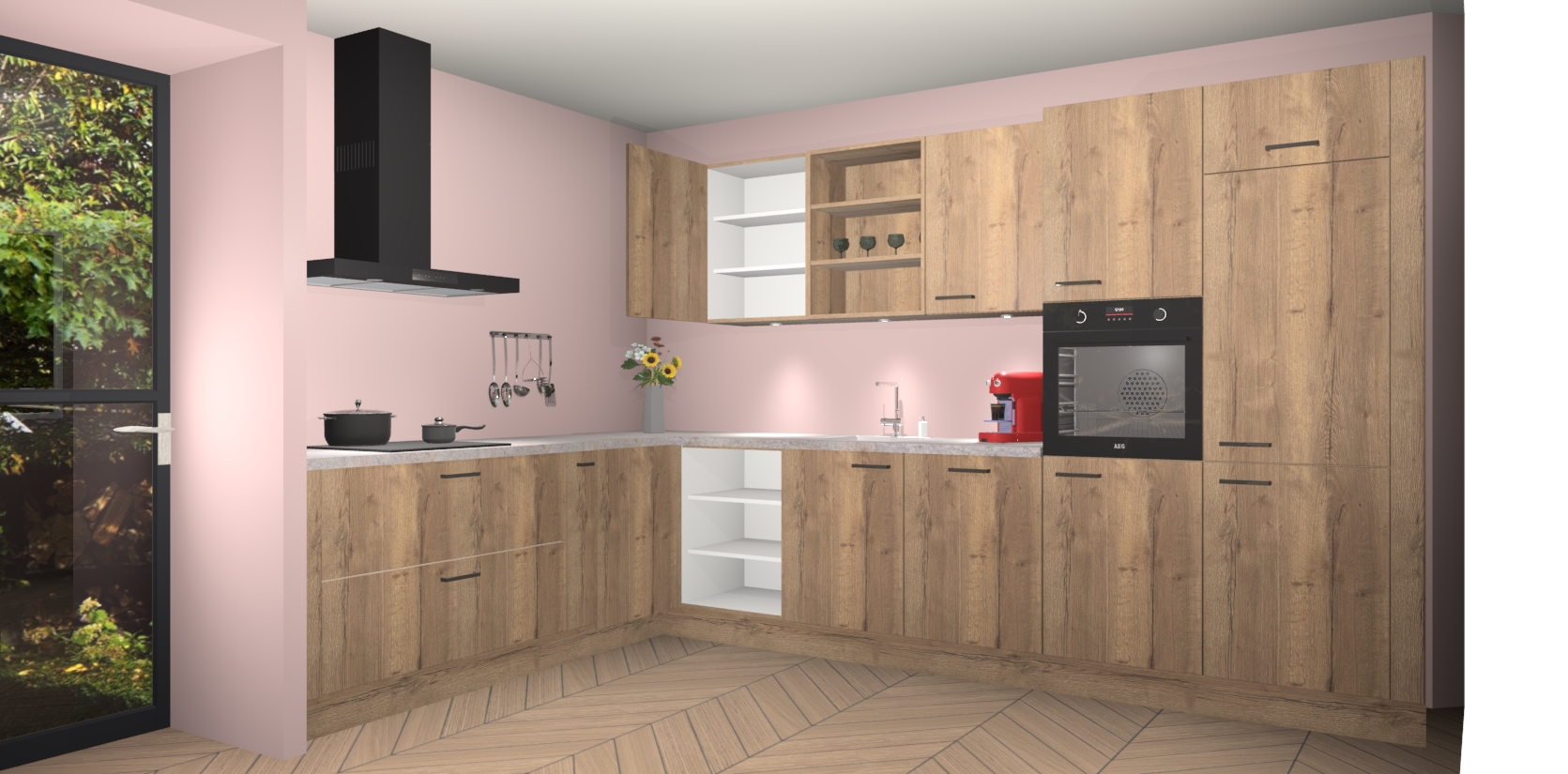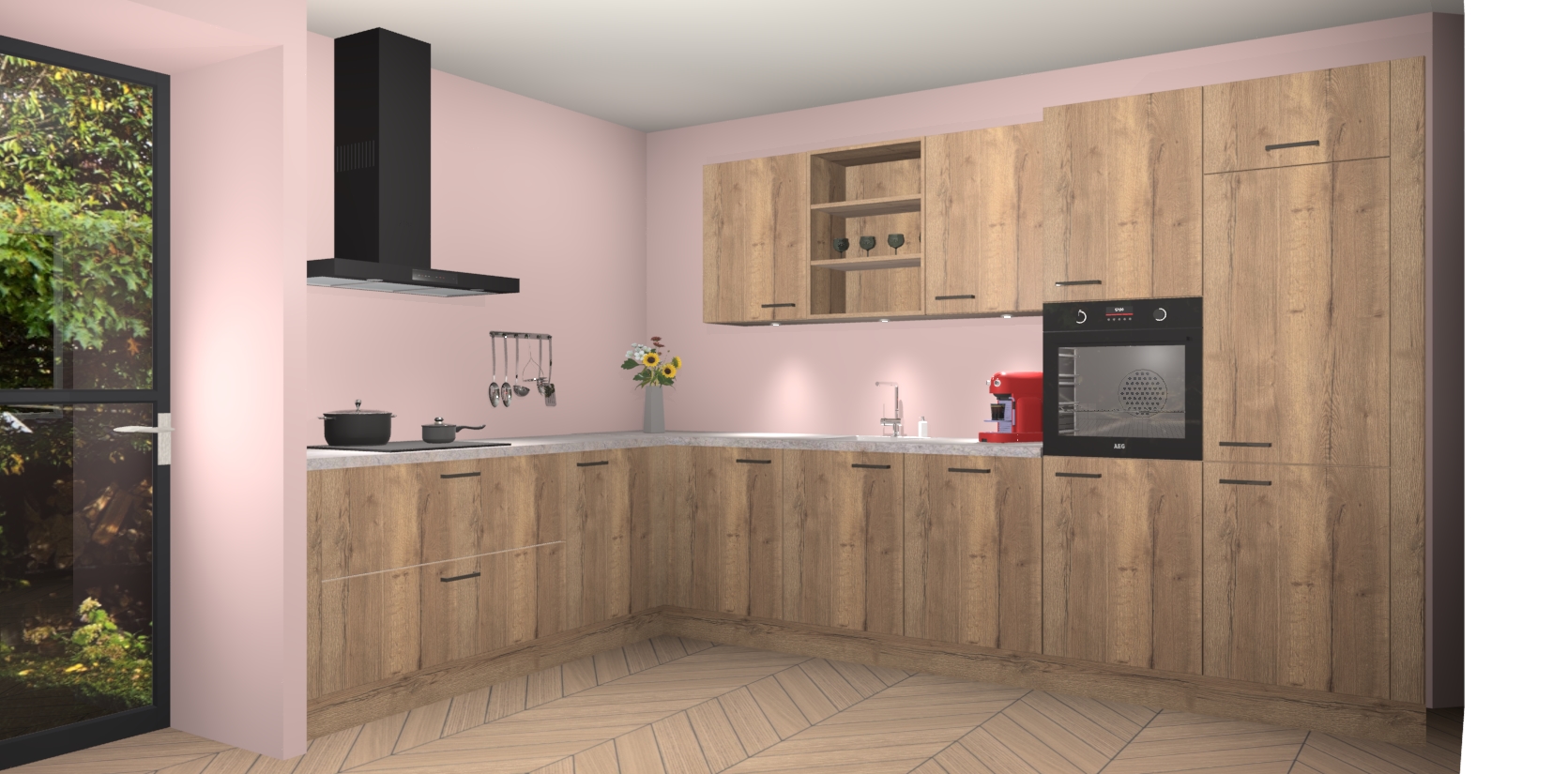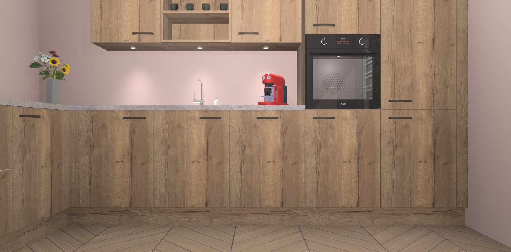 De Chocolade Eiken keuken Gotenburg is zo ontworpen dat u alle mogelijke vormen van opslagruimte kunt genieten. Bovendien heeft u meteen toegang tot vijf ingebouwde apparaten: een oven, inductiekookplaat, afzuigkap, vaatwasser en koelkast. Gewoon upgraden naar AEG na bestelling? Dit kan heel gemakkelijk worden geregeld. De deuren sluiten zacht dankzij zachtsluitende scharnieren en ze houden warmte vast terwijl ze uitzonderlijk stil blijven wanneer ze worden geopend of gesloten.