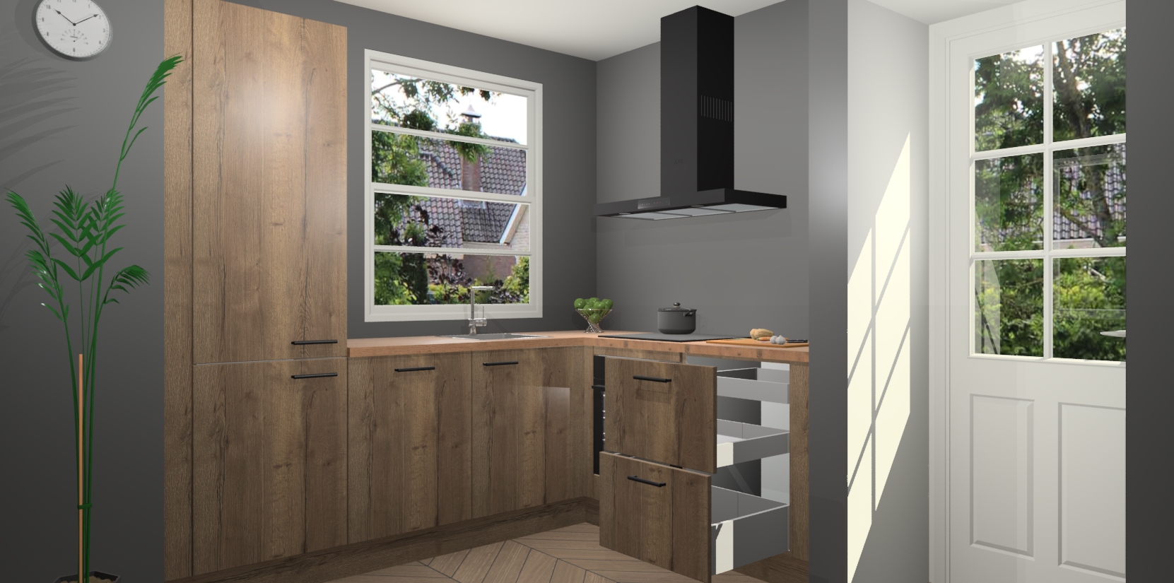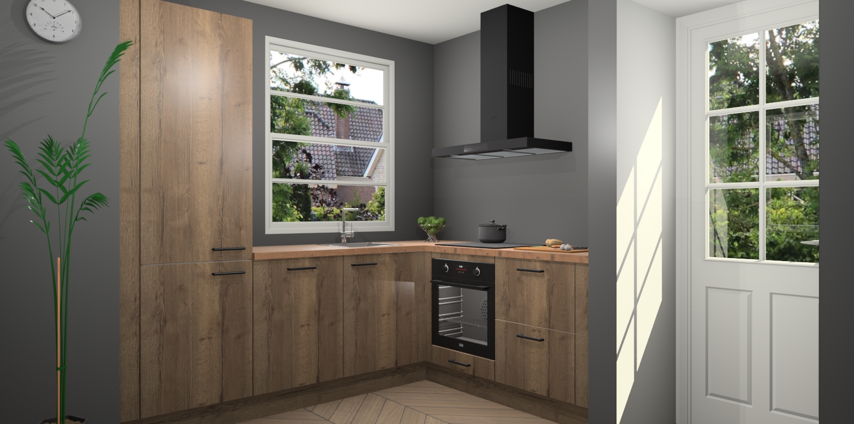 Wilt u een echte aanwinst voor uw keuken, maar bent u op zoek naar iets specialers dan de standaardkeukens? Kies dan voor de Chocolade Eiken keuken Harbin! Dit prachtige hoekkeukenontwerp geeft u alle ruimte om optimaal te genieten van heerlijk koken. Het uitmuntende afwerkingsniveau, de fraaie houtstructuur en de sfeervolle zwarte grepen maken van de Chocolade Eiken keuken Harbin de perfecte keuze voor zowel enthousiaste thuiskoks als design-minded interieurliefhebbers.