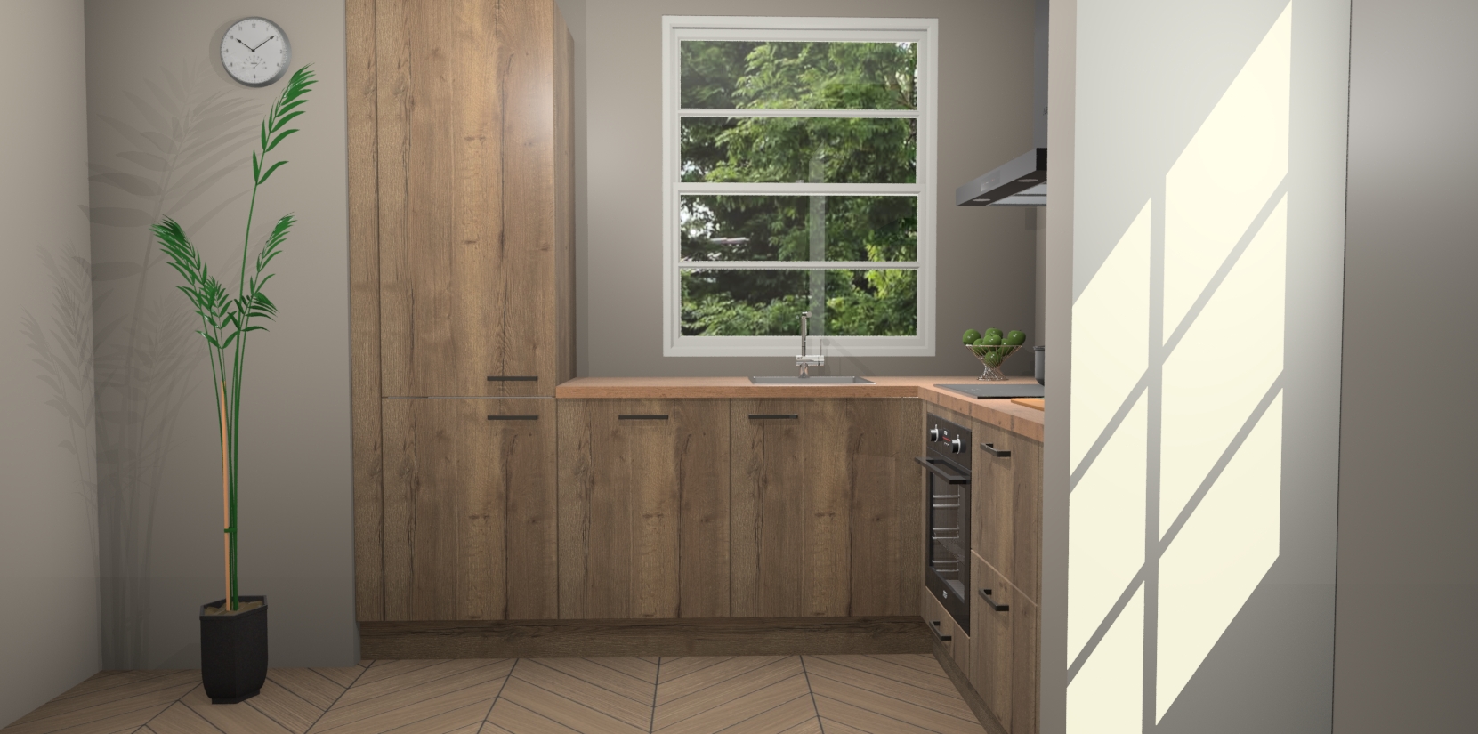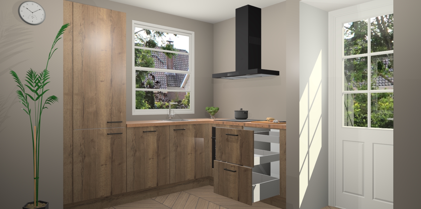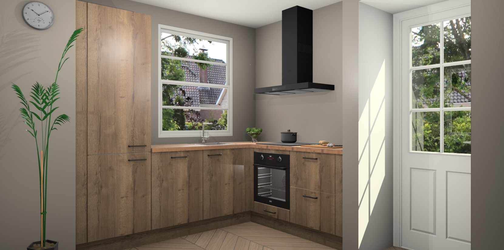 Wilt u een echte aanwinst voor uw keuken, maar bent u op zoek naar iets specialers dan de standaardkeukens? Kies dan voor de Chocolade Eiken keuken Harbin! Dit prachtige hoekkeukenontwerp geeft u alle ruimte om optimaal te genieten van heerlijk koken. Het uitmuntende afwerkingsniveau, de fraaie houtstructuur en de sfeervolle zwarte grepen maken van de Chocolade Eiken keuken Harbin de perfecte keuze voor zowel enthousiaste thuiskoks als design-minded interieurliefhebbers.