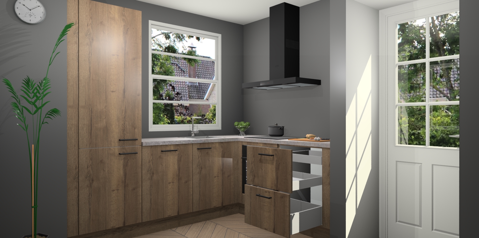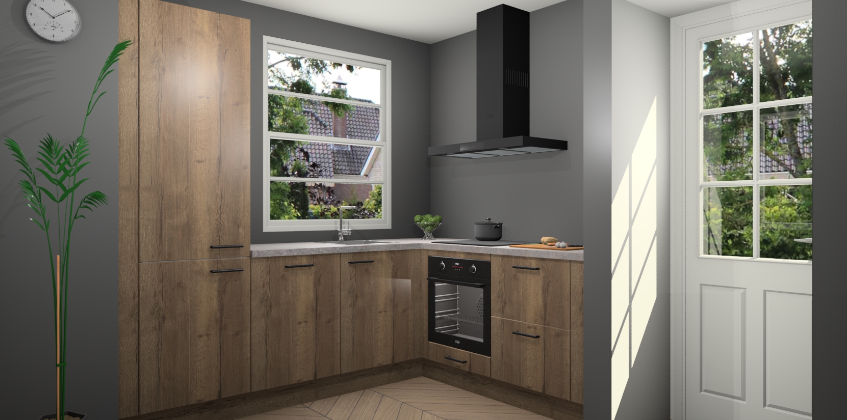 Wilt u een echte aanwinst voor uw keuken, maar bent u op zoek naar iets specialers dan de standaardkeukens? Kies dan voor de Chocolade Eiken keuken Harbin! Dit prachtige hoekkeukenontwerp geeft u alle ruimte om optimaal te genieten van heerlijk koken. Het uitmuntende afwerkingsniveau, de fraaie houtstructuur en de sfeervolle zwarte grepen maken van de Chocolade Eiken keuken Harbin de perfecte keuze voor zowel enthousiaste thuiskoks als design-minded interieurliefhebbers.