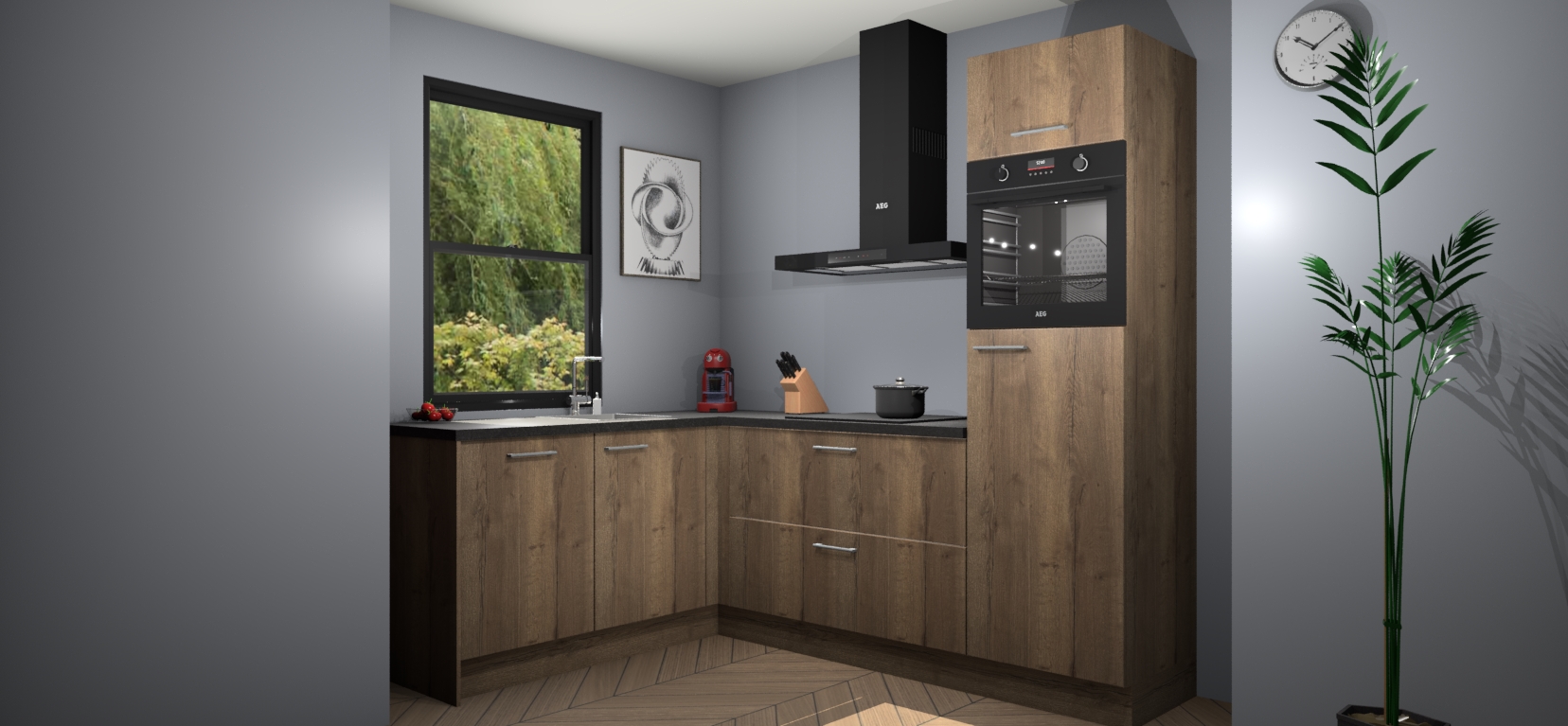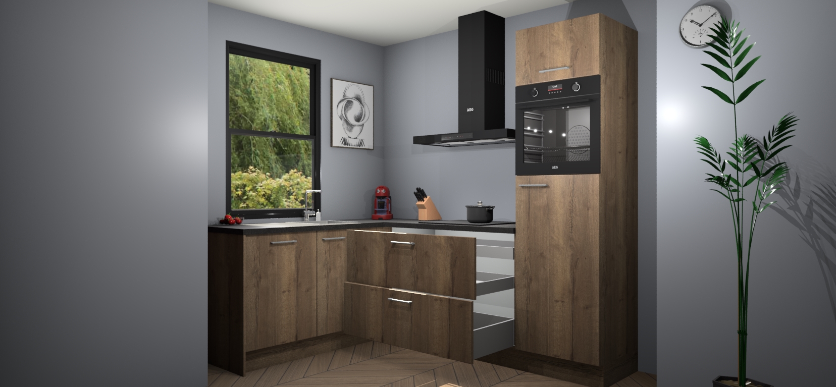 Deze prachtige hoekkeuken heeft alle benodigdheden om uw droomkook- en eetruimte compleet te maken. De Chocolade Eiken kasten bieden een echo van raffinement, terwijl de 5 inbouwapparaten genoeg opties bieden voor het bereiden van heerlijke maaltijden. De oven, inductiekookplaat, afzuigkap, vaatwasser en koelkast zorgen ervoor dat u tijd in de keuken zo efficiënt mogelijk verloopt, terwijl ze ook dat extra vleugje luxe bieden.