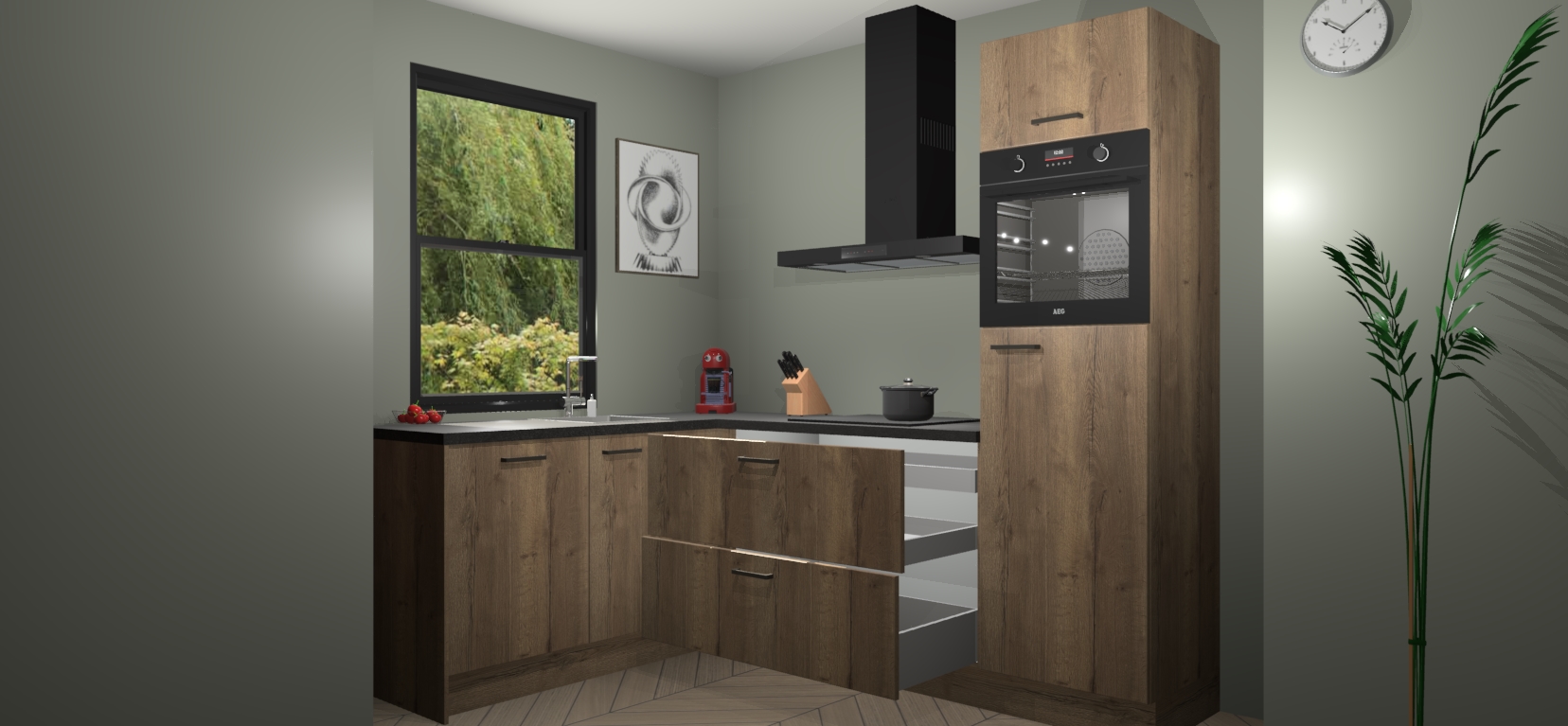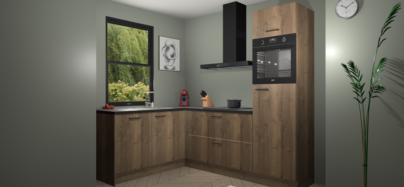 Deze prachtige hoekkeuken heeft alle benodigdheden om uw droomkook- en eetruimte compleet te maken. De Chocolade Eiken kasten bieden een echo van raffinement, terwijl de 5 inbouwapparaten genoeg opties bieden voor het bereiden van heerlijke maaltijden. De oven, inductiekookplaat, afzuigkap, vaatwasser en koelkast zorgen ervoor dat u tijd in de keuken zo efficiënt mogelijk verloopt, terwijl ze ook dat extra vleugje luxe bieden.