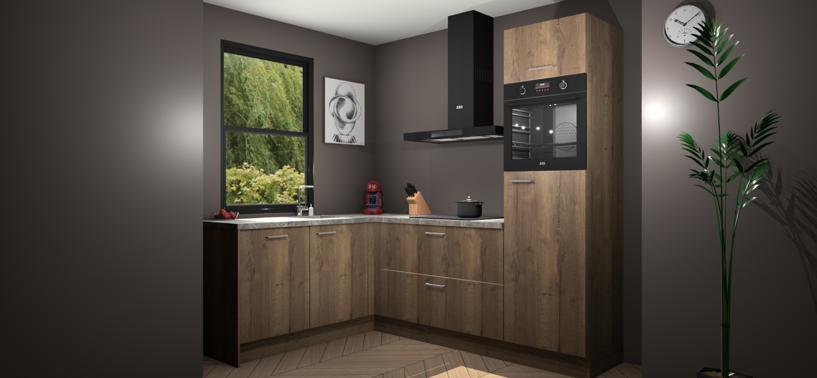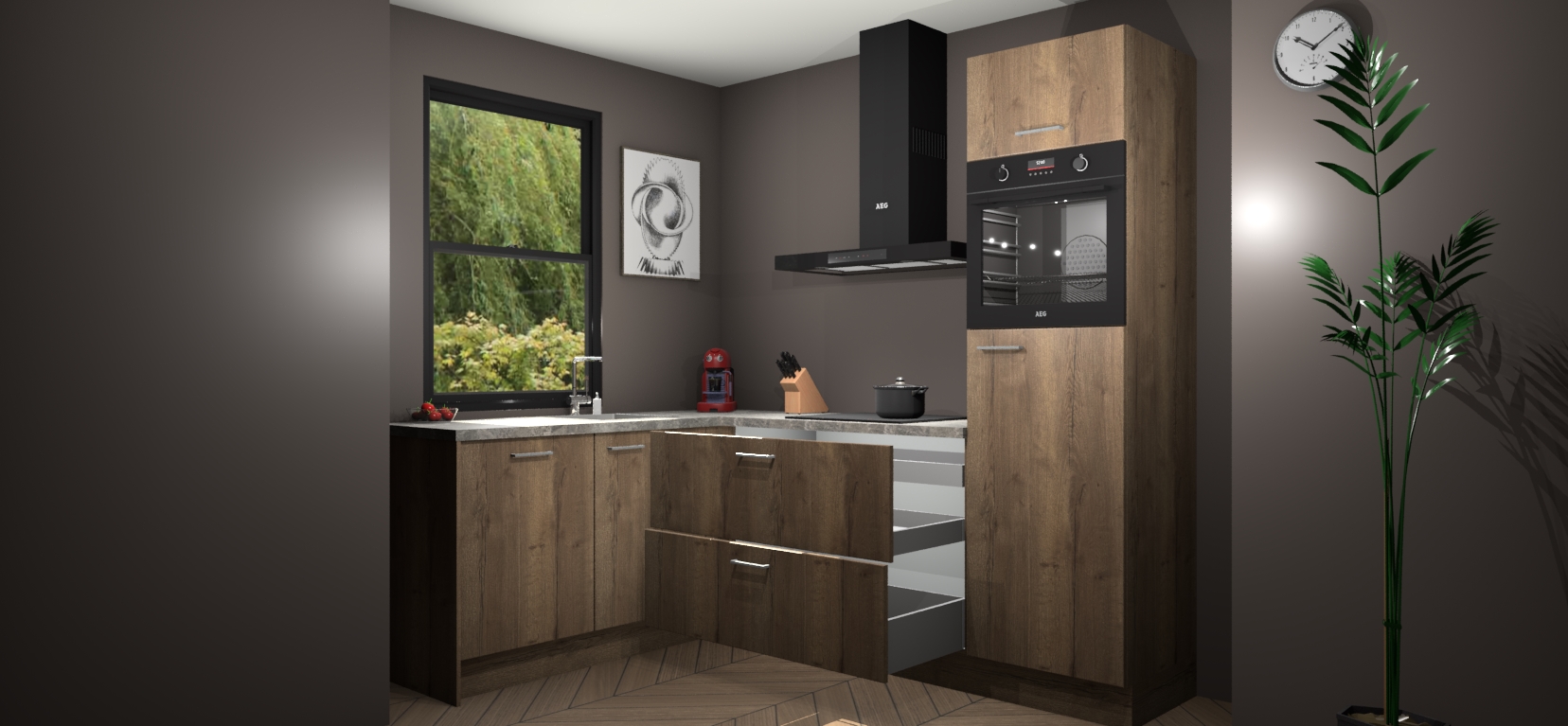 Deze prachtige hoekkeuken heeft alle benodigdheden om uw droomkook- en eetruimte compleet te maken. De Chocolade Eiken kasten bieden een echo van raffinement, terwijl de 5 inbouwapparaten genoeg opties bieden voor het bereiden van heerlijke maaltijden. De oven, inductiekookplaat, afzuigkap, vaatwasser en koelkast zorgen ervoor dat u tijd in de keuken zo efficiënt mogelijk verloopt, terwijl ze ook dat extra vleugje luxe bieden.