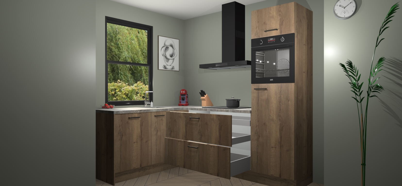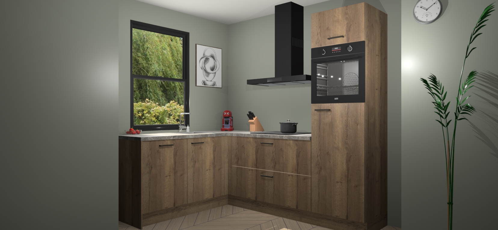 Deze prachtige hoekkeuken heeft alle benodigdheden om uw droomkook- en eetruimte compleet te maken. De Chocolade Eiken kasten bieden een echo van raffinement, terwijl de 5 inbouwapparaten genoeg opties bieden voor het bereiden van heerlijke maaltijden. De oven, inductiekookplaat, afzuigkap, vaatwasser en koelkast zorgen ervoor dat u tijd in de keuken zo efficiënt mogelijk verloopt, terwijl ze ook dat extra vleugje luxe bieden.