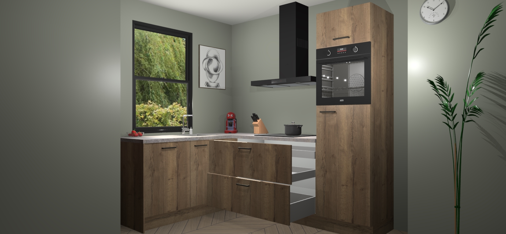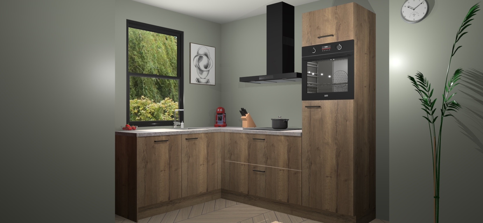 Deze prachtige hoekkeuken heeft alle benodigdheden om uw droomkook- en eetruimte compleet te maken. De Chocolade Eiken kasten bieden een echo van raffinement, terwijl de 5 inbouwapparaten genoeg opties bieden voor het bereiden van heerlijke maaltijden. De oven, inductiekookplaat, afzuigkap, vaatwasser en koelkast zorgen ervoor dat u tijd in de keuken zo efficiënt mogelijk verloopt, terwijl ze ook dat extra vleugje luxe bieden.